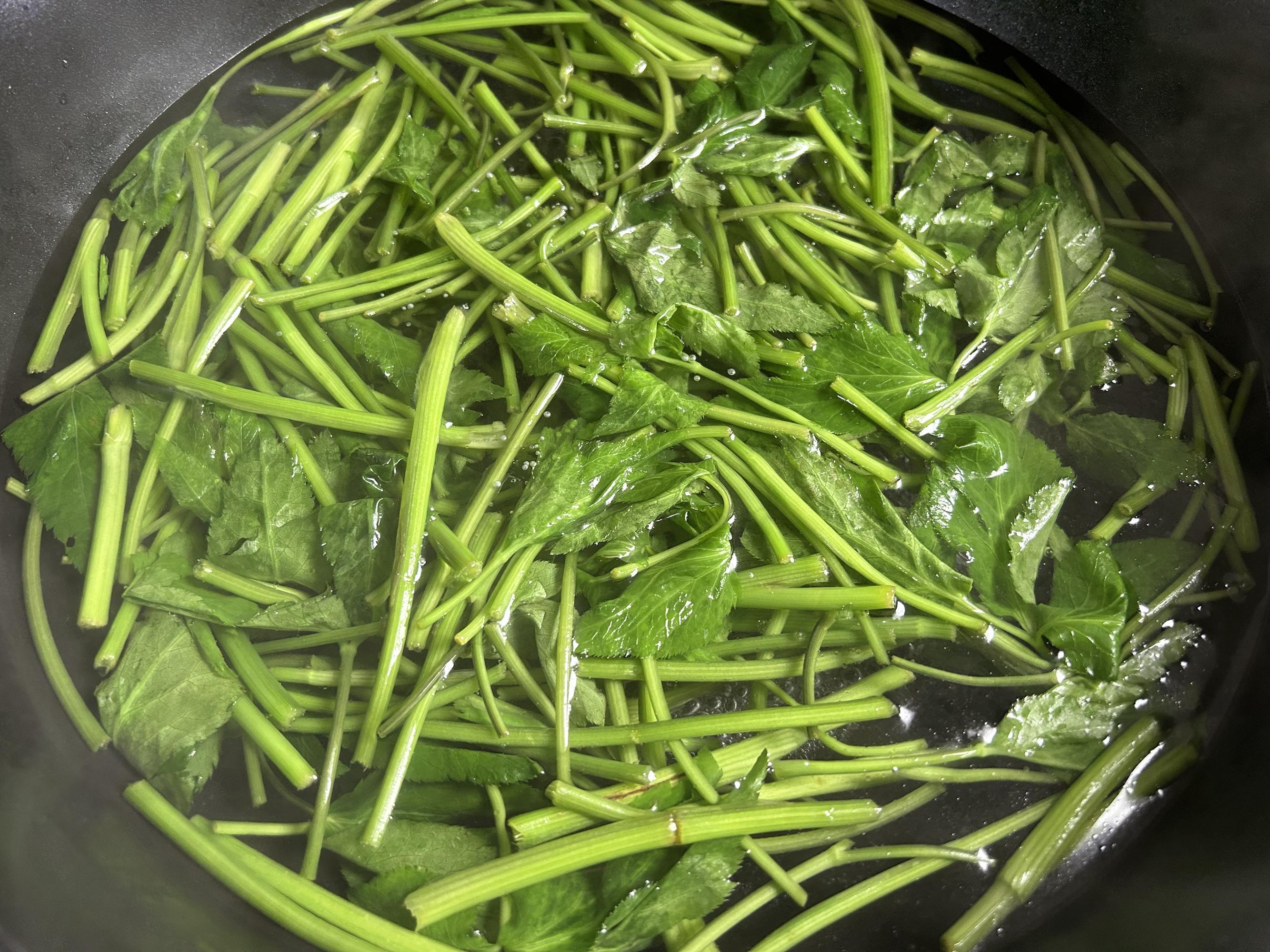 燒一鍋熱開水,放幾滴油和半勺鹽,大火持續加熱,放入鴨腳板菜焯水到斷生,撈出來過涼水,瀝乾水分。