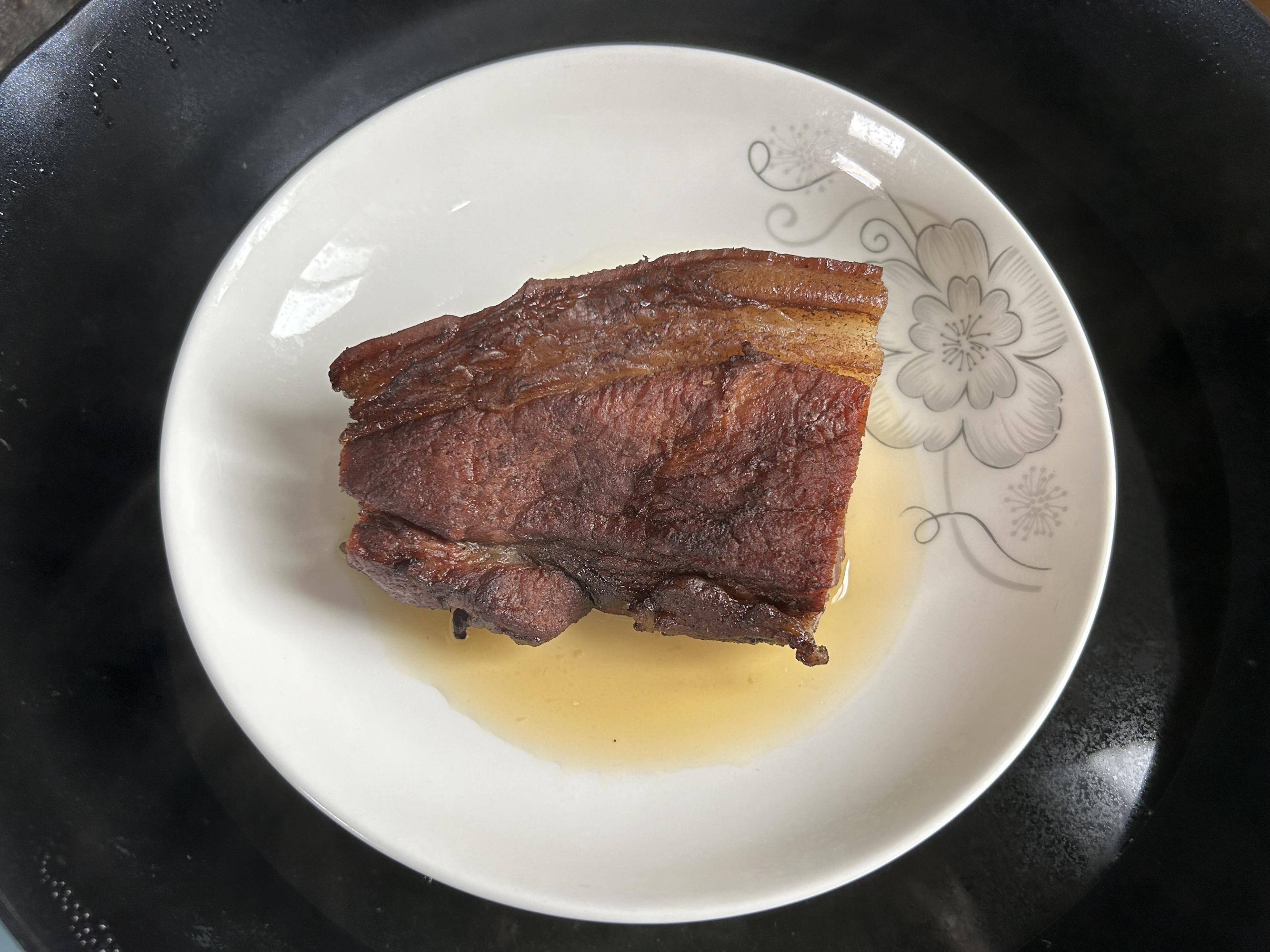 就着同一鍋熱開水,把清洗乾淨的臘肉,放入鍋裏,大火隔水蒸8分鐘,蒸到變軟。