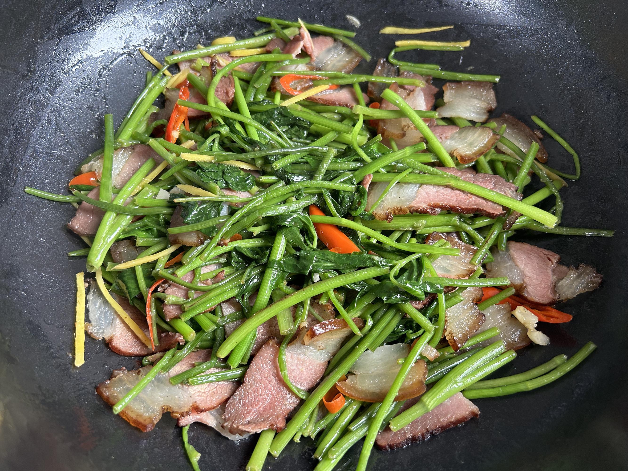 加入焯過水的鴨腳板菜,跟臘肉一起混合均勻。由於臘肉本身比較鹹,建議嘗一下味道再決定要不要加鹽調味。