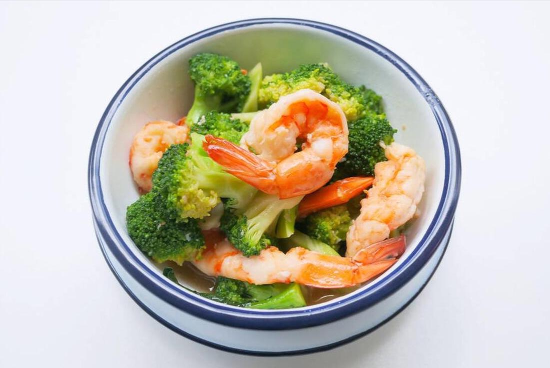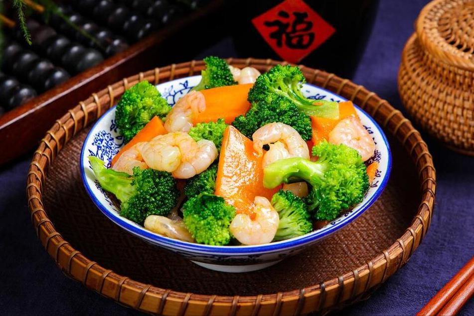用到:西蘭花、大蒜、薑片、胡蘿蔔、蝦仁、鹽、白胡椒粉、雞精、生抽、食用油