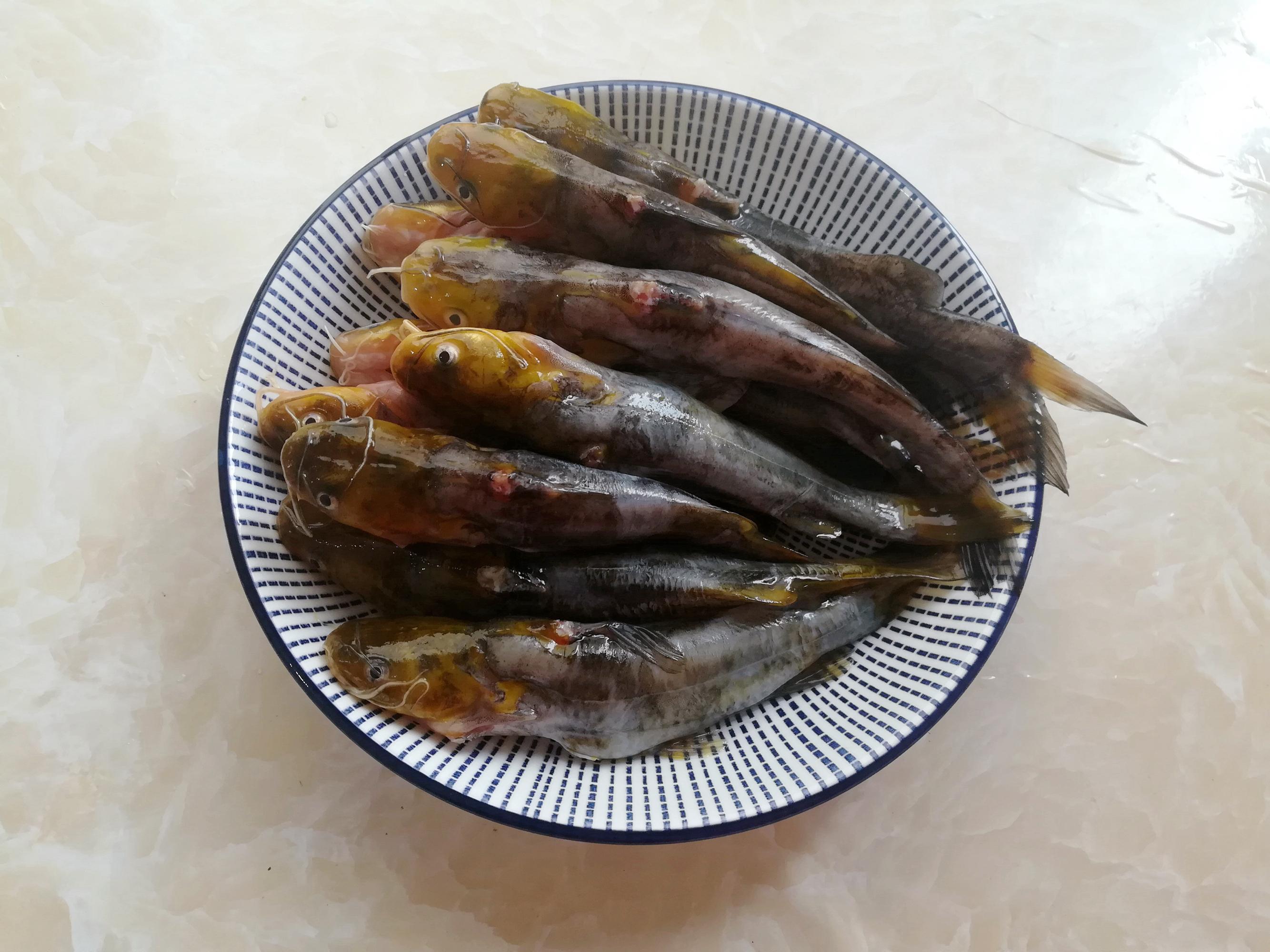 黃骨魚清理乾淨魚鰓和內臟,用熱開水燙2分鐘,洗掉魚身表面灰白色的黏液,這樣可以去掉魚腥味。爲了避免被頭部的大刺扎到手,我用雞骨剪把所有黃骨魚的大刺都剪掉了。
