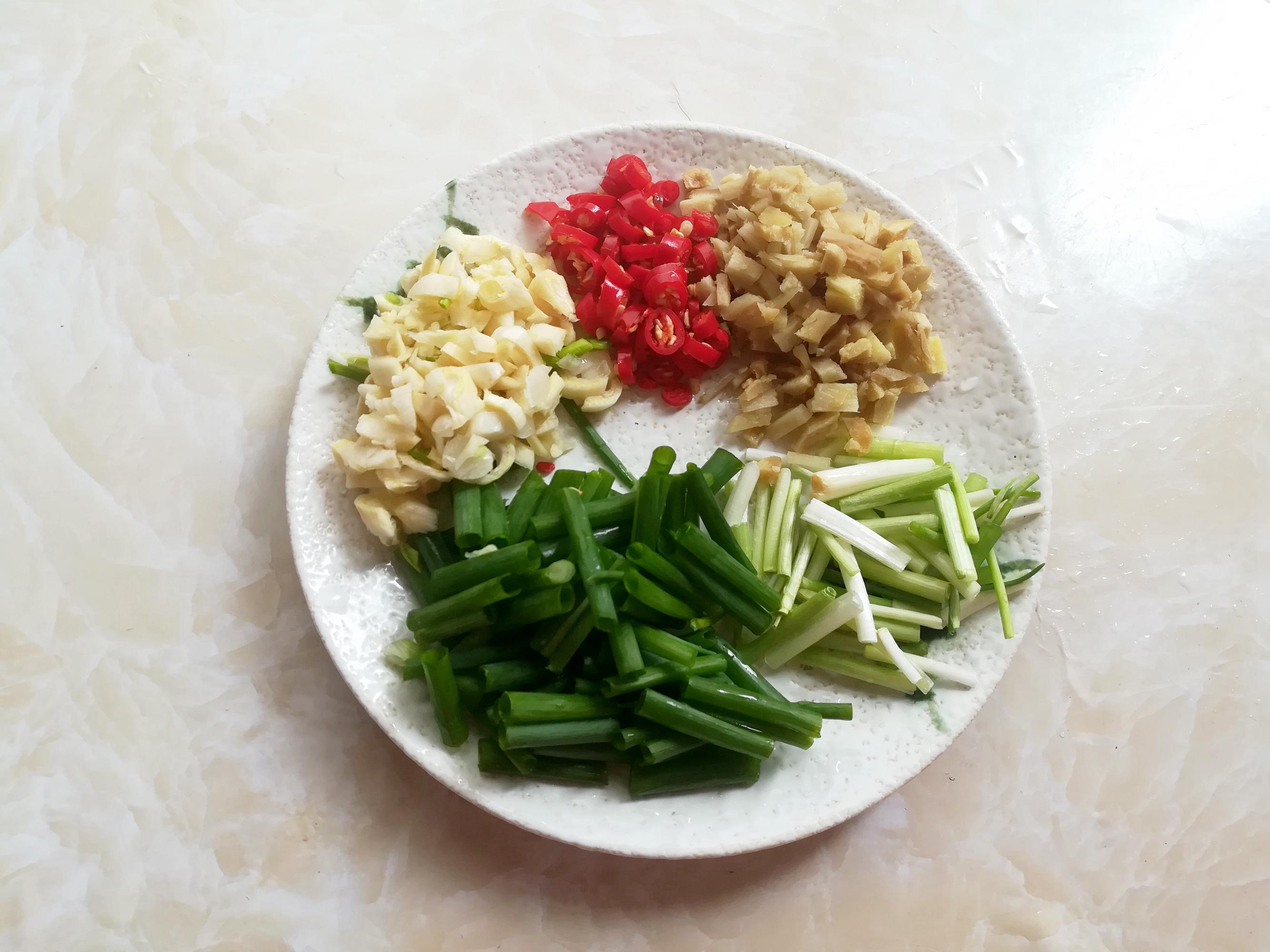 香蔥清洗乾淨,分別切出蔥白和蔥段,大蒜去皮切顆粒,小米椒切圓圈,生薑去皮切顆粒。準備一個小碗調醬汁,放入料酒、生抽、白胡椒粉和白砂糖混合均勻,放一邊備用。