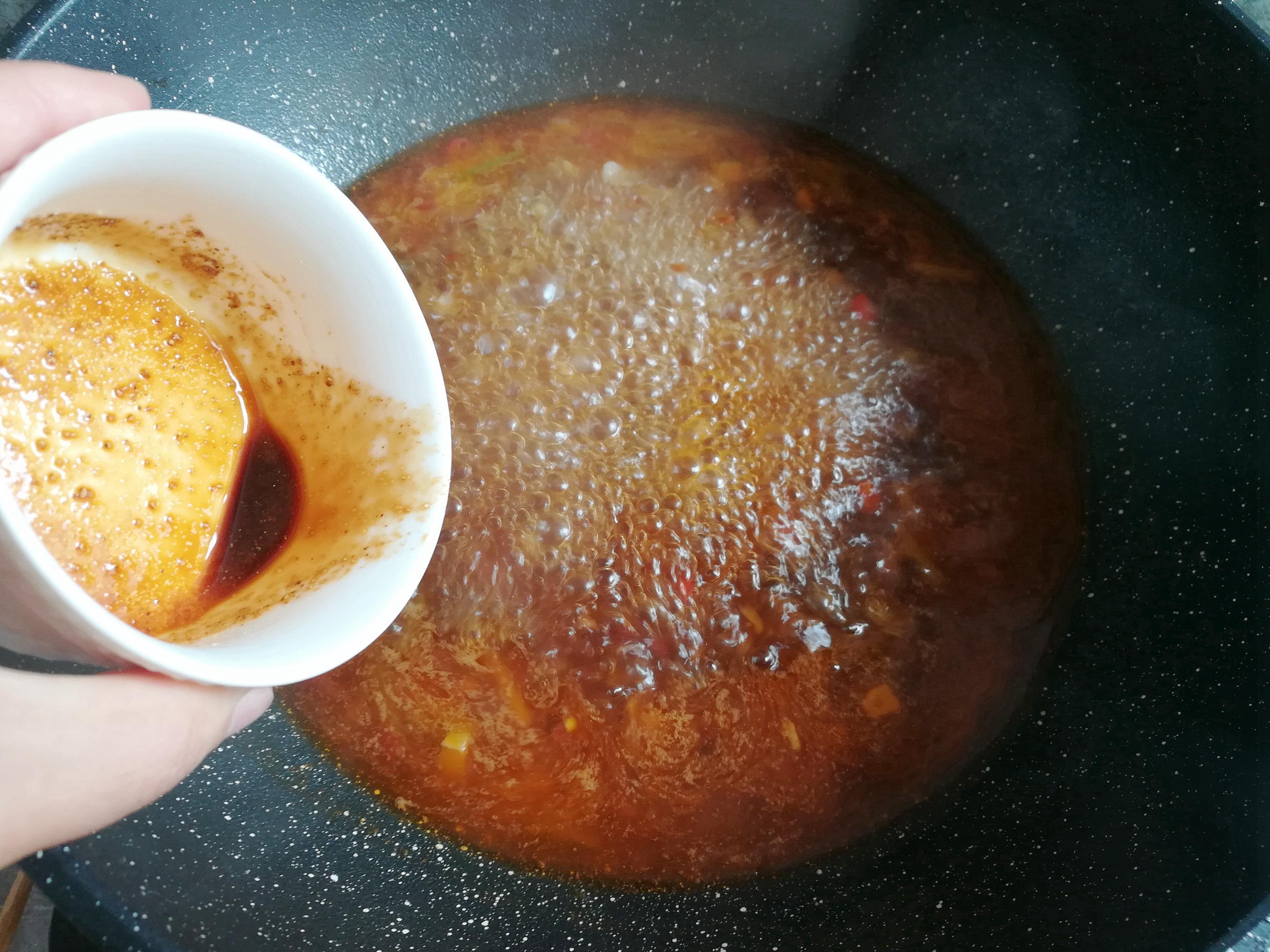 加2碗水大火煮開,加入調好的醬汁煮2分鐘。