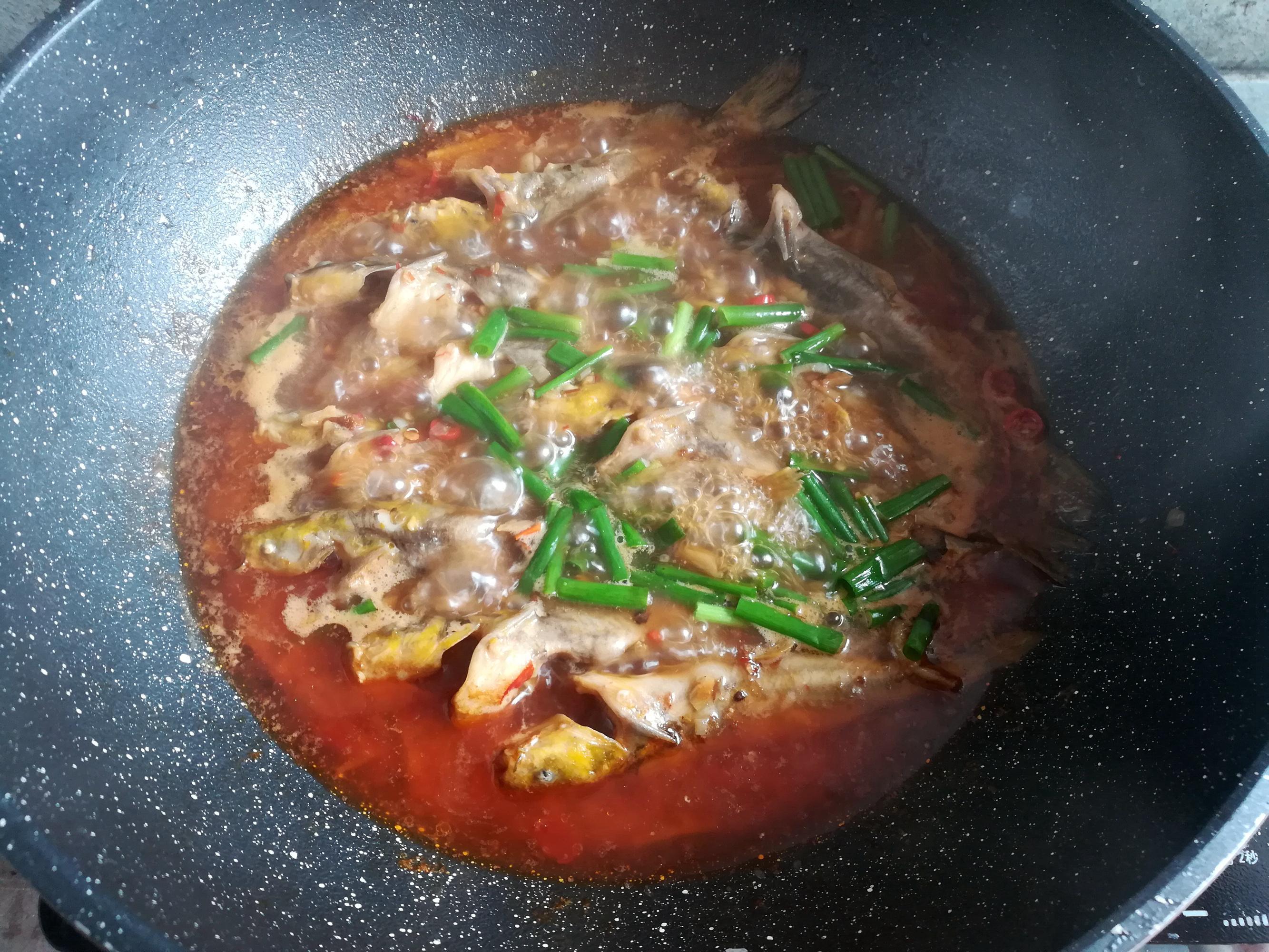 大火收汁,嘗一下湯汁的味道,按照口味加入適量的鹽調味,出鍋前撒上蔥段,一道營養好喫的香辣黃骨魚就做好了。