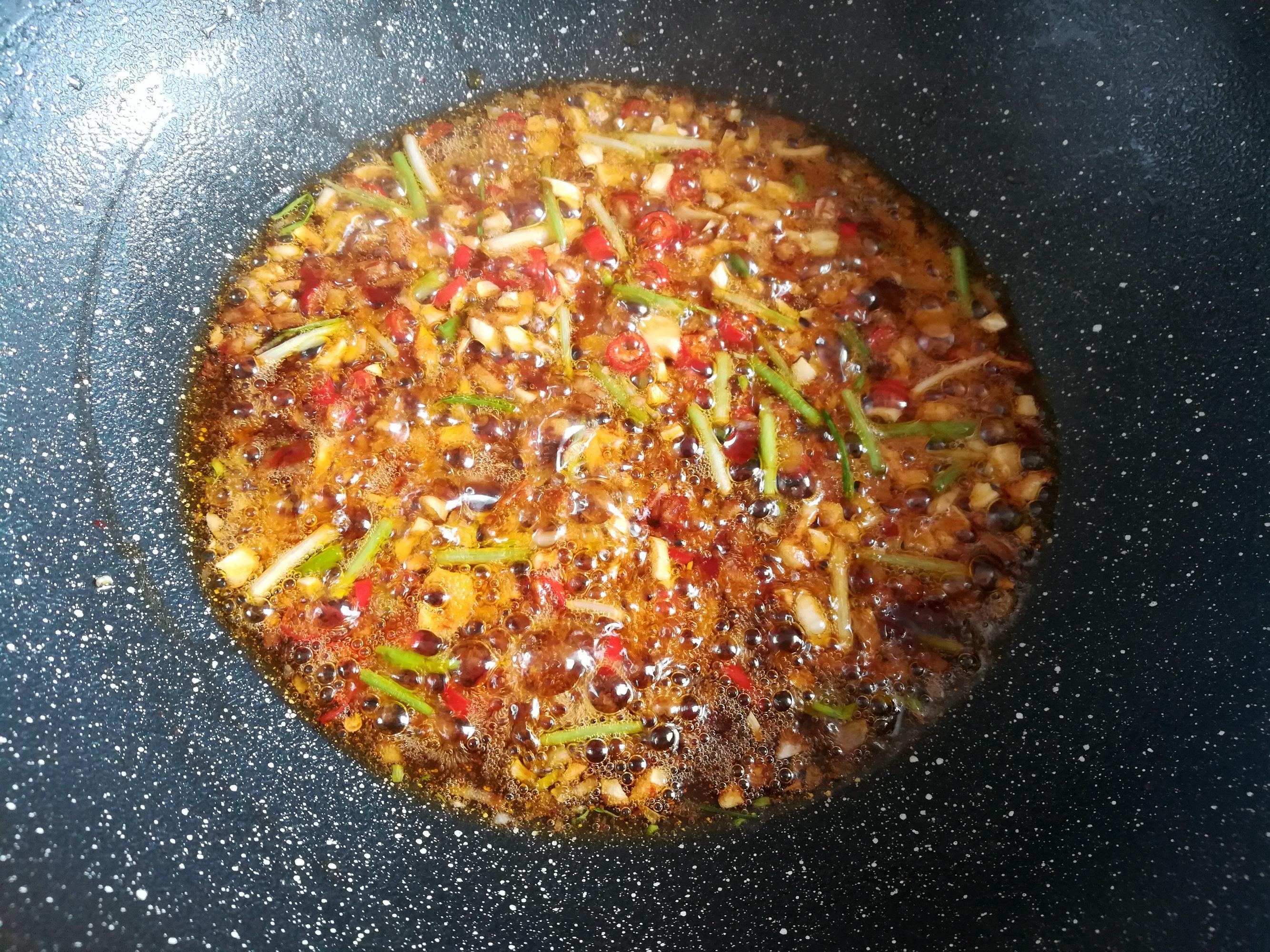 熱鍋放油,放入姜蒜和小米椒熗鍋,加入蔥白翻炒出香味,加入郫縣豆瓣醬炒出顏色。