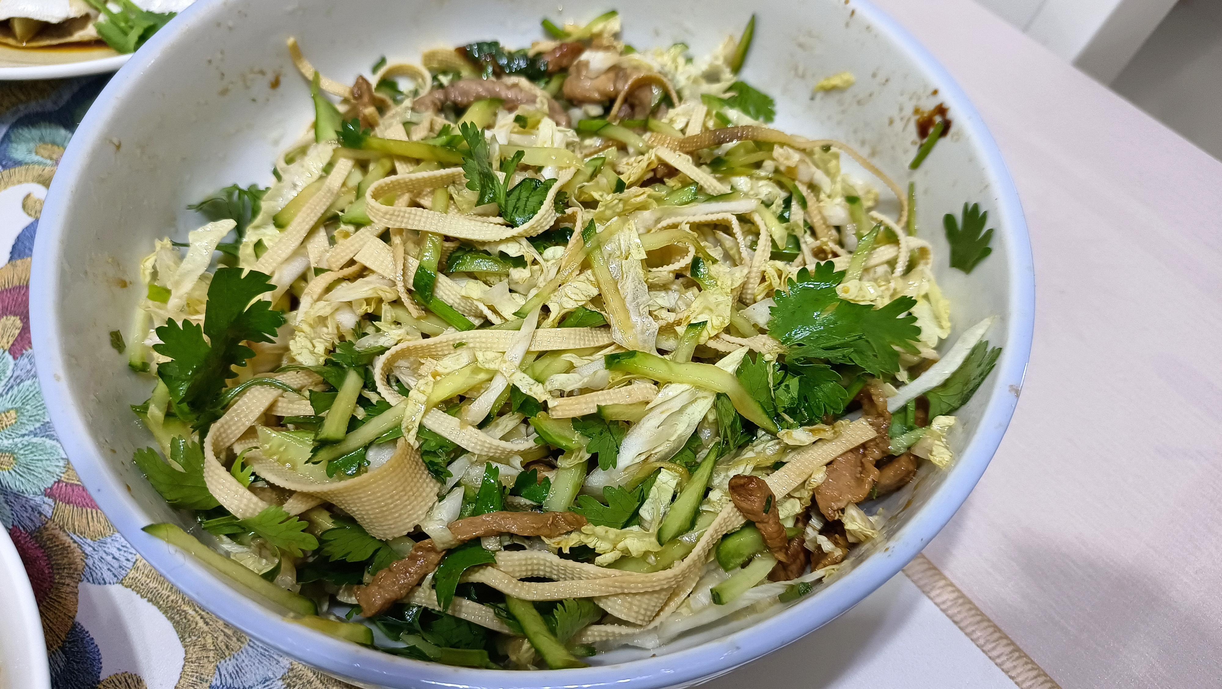 大拉皮切條、黃瓜切絲、幹豆腐切絲、白菜心切絲、香菜切段、大蒜剁成蒜末後放入大碗中備用;再取一小塊豬肉切成肉絲,起鍋加油,油溫5成熱時放入肉絲,炒熟後加入一勺生抽,翻炒均勻後將其倒切好的涼菜中,然後再加入適量的鹽、白糖和米醋,喜歡喫辣的朋友還可以再加一點辣椒油,攪拌均勻後就可以開喫了!
