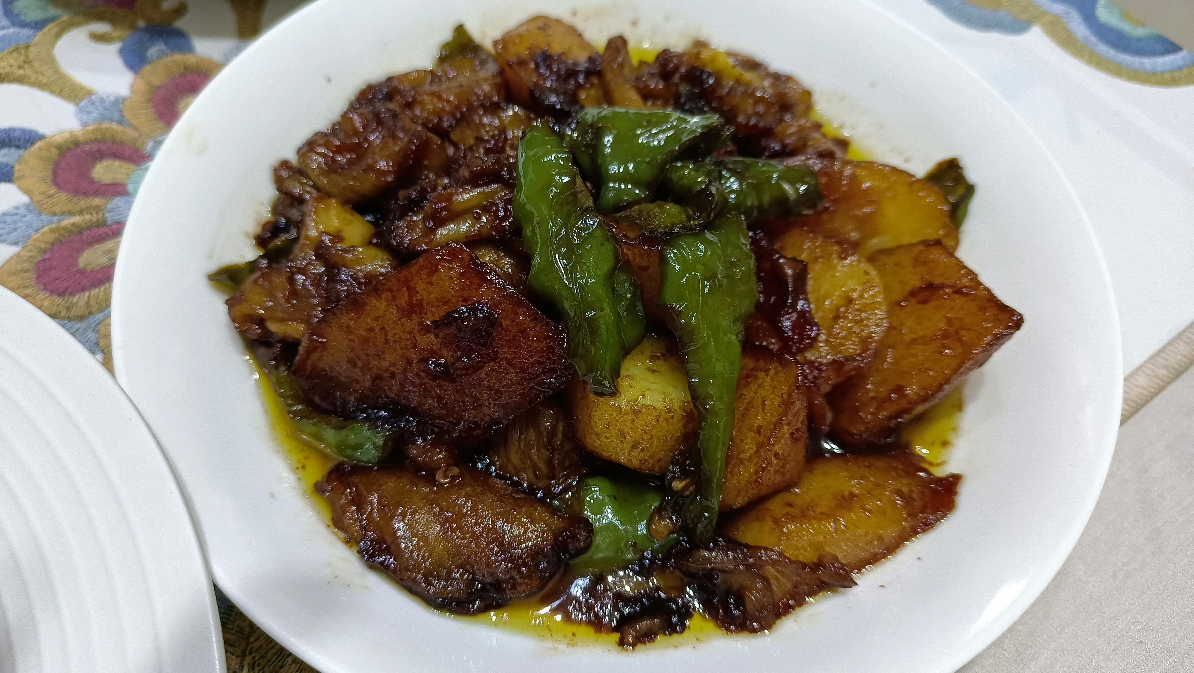 另起鍋加少許油,下入蒜末爆香後再放入青椒塊,炒軟後下入土豆塊和茄子塊,然後倒入調好料汁,煮至湯汁完全吸收後就可以關火出鍋了。這道菜特下飯,每次做它我都要多喫一碗大米飯。