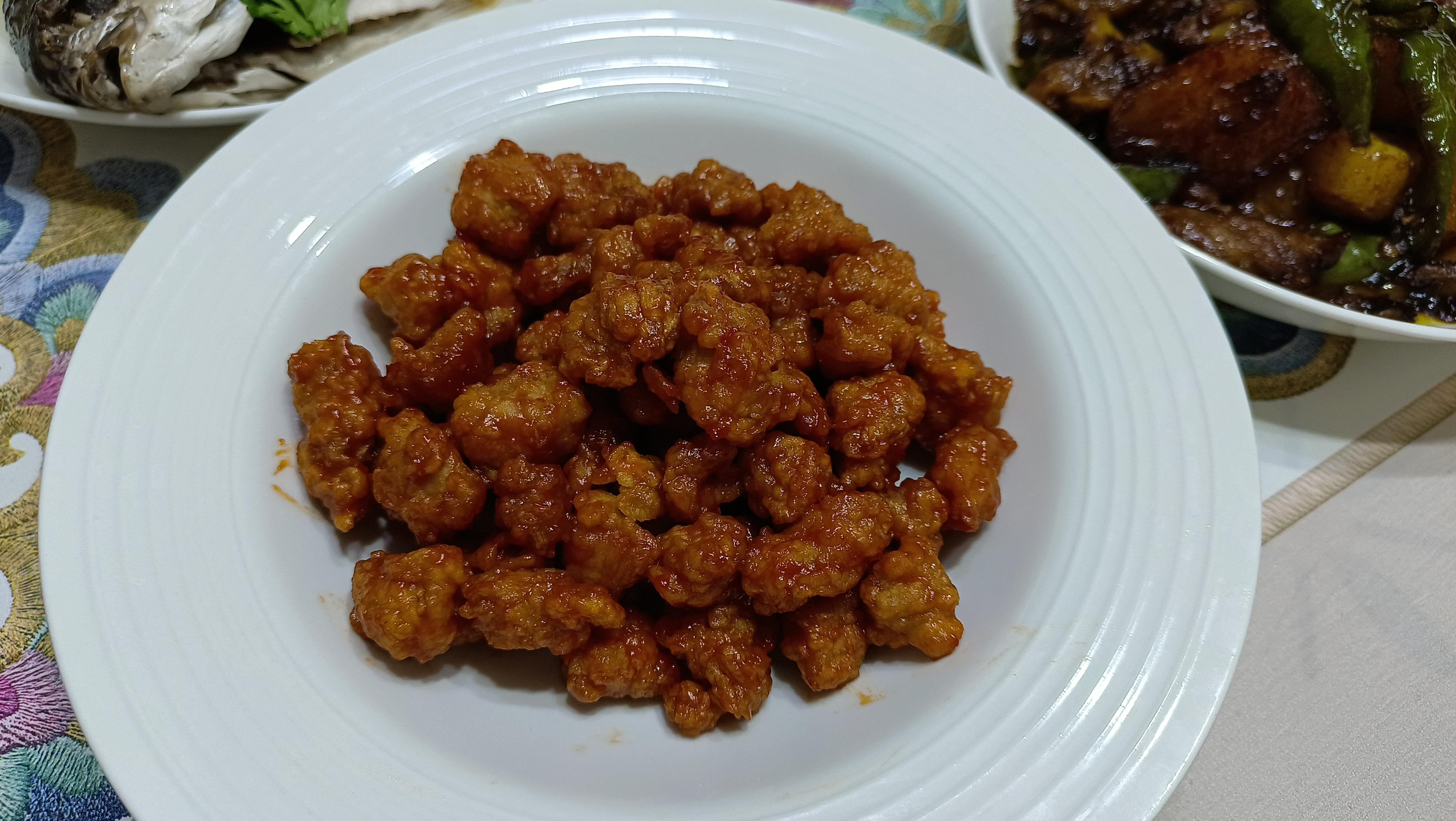 然後取一個盤子,分別加入2勺麪粉和一勺澱粉,攪拌均勻後,再將醃製入味的肉塊放到麪粉中,用手抓拌一會兒,讓每塊小肉塊都均勻地裹上面粉;再起鍋加油,油溫6成熱時,下入肉塊,炸至肉塊呈金黃色時控油撈出。