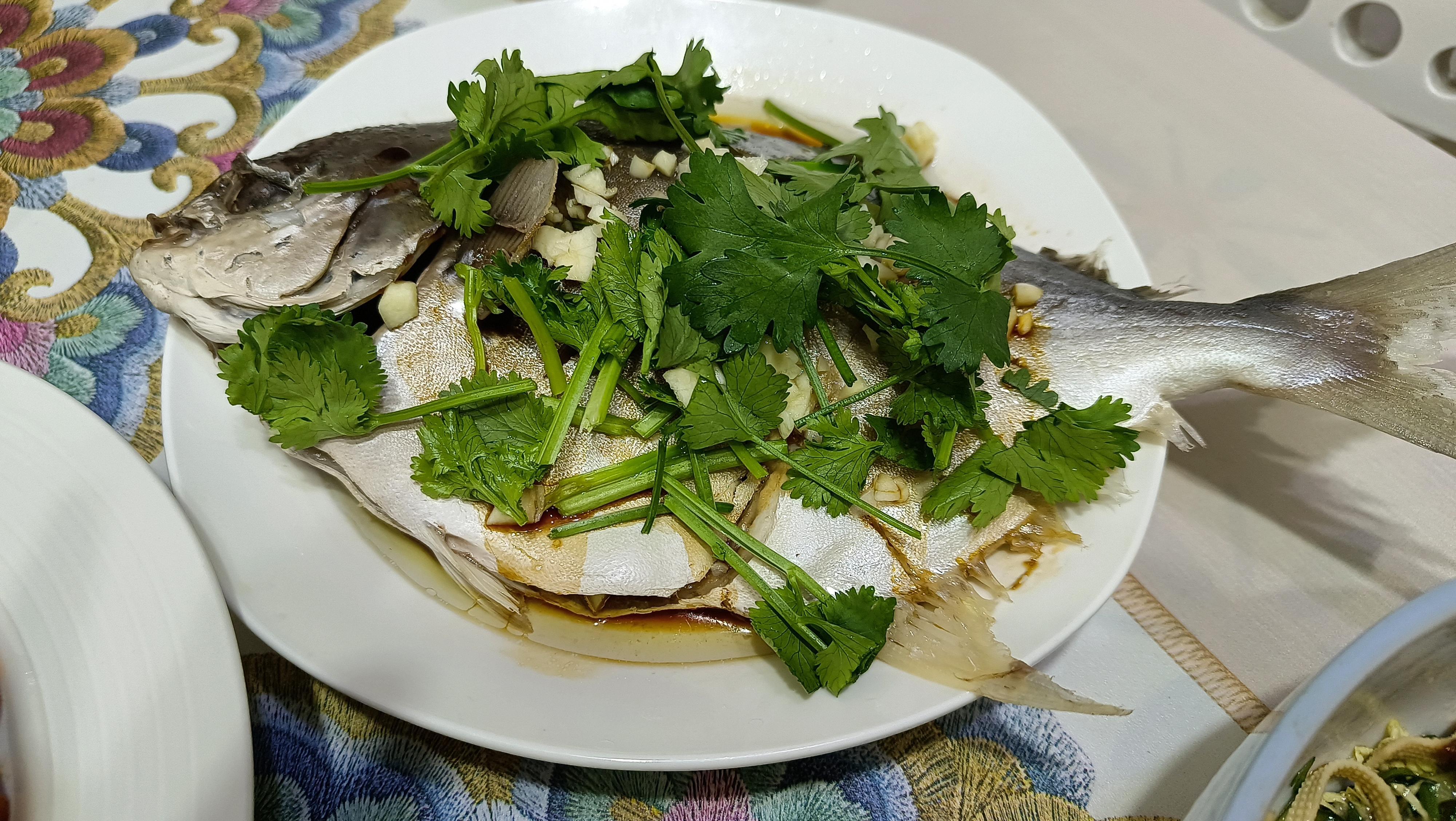 先把鯧魚內臟去掉清洗乾淨,然後正反打花刀方便入味,在花刀和肚子裏放上薑絲和蒜片,再撒一勺食鹽,兩勺料酒,放到蒸鍋中蒸12分鐘左右;蒸好後把湯汁倒掉不要,然後再用生抽1勺、蠔油1勺、少許鹽和開水攪拌均勻後淋到魚肉上,再在上面擺上蒜末、香菜和蔥花(家裏沒有蔥了,我就沒放),最後淋上剛剛燒開的熱油,美味即成,鮮美極了!