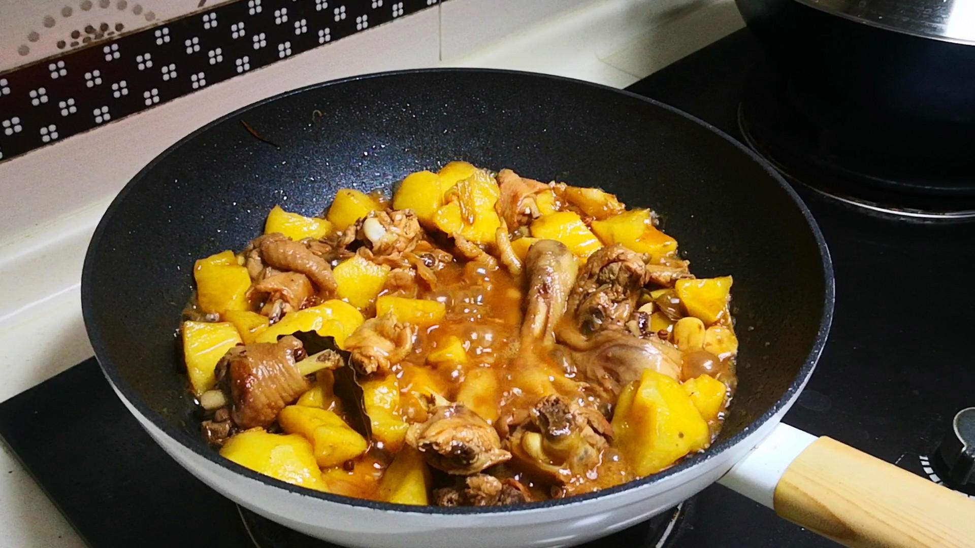 4.起鍋加油,油溫5成熱時放入蔥花、蒜片、薑片、香葉、八角和花椒,炒香後再下入雞肉塊,然後用鏟子不停地翻炒,多炒一會兒,把雞肉中的水氣炒出來,這樣雞肉喫着會更香。翻炒約五六分鐘後,可以雞肉的表皮已經變微黃了,這時再加入適量的老抽、生抽、甜麪醬和黃豆醬,繼續翻炒均勻後倒入土豆塊,然後加入沒過食材的清水,蓋上蓋子大火燒開後轉中小火繼續燉。