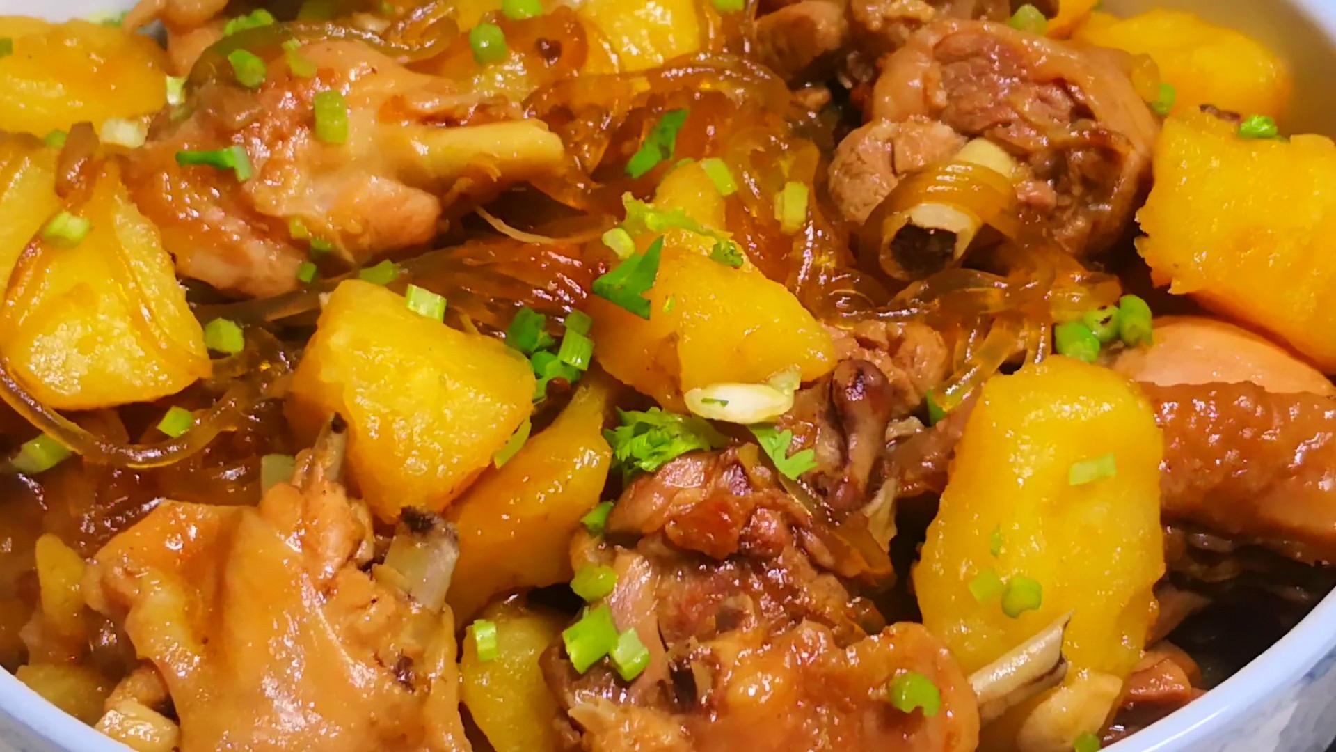 5.大約燉半個小時後再把泡軟的粉條放入,並把粉條攪拌按壓一下,讓其浸泡到湯汁中,使其充分入味,繼續燉五分鐘後就可以關火了,出鍋前撒點雞精、蔥花和香菜提鮮,營養好喫的雞肉燜土豆就做好了。