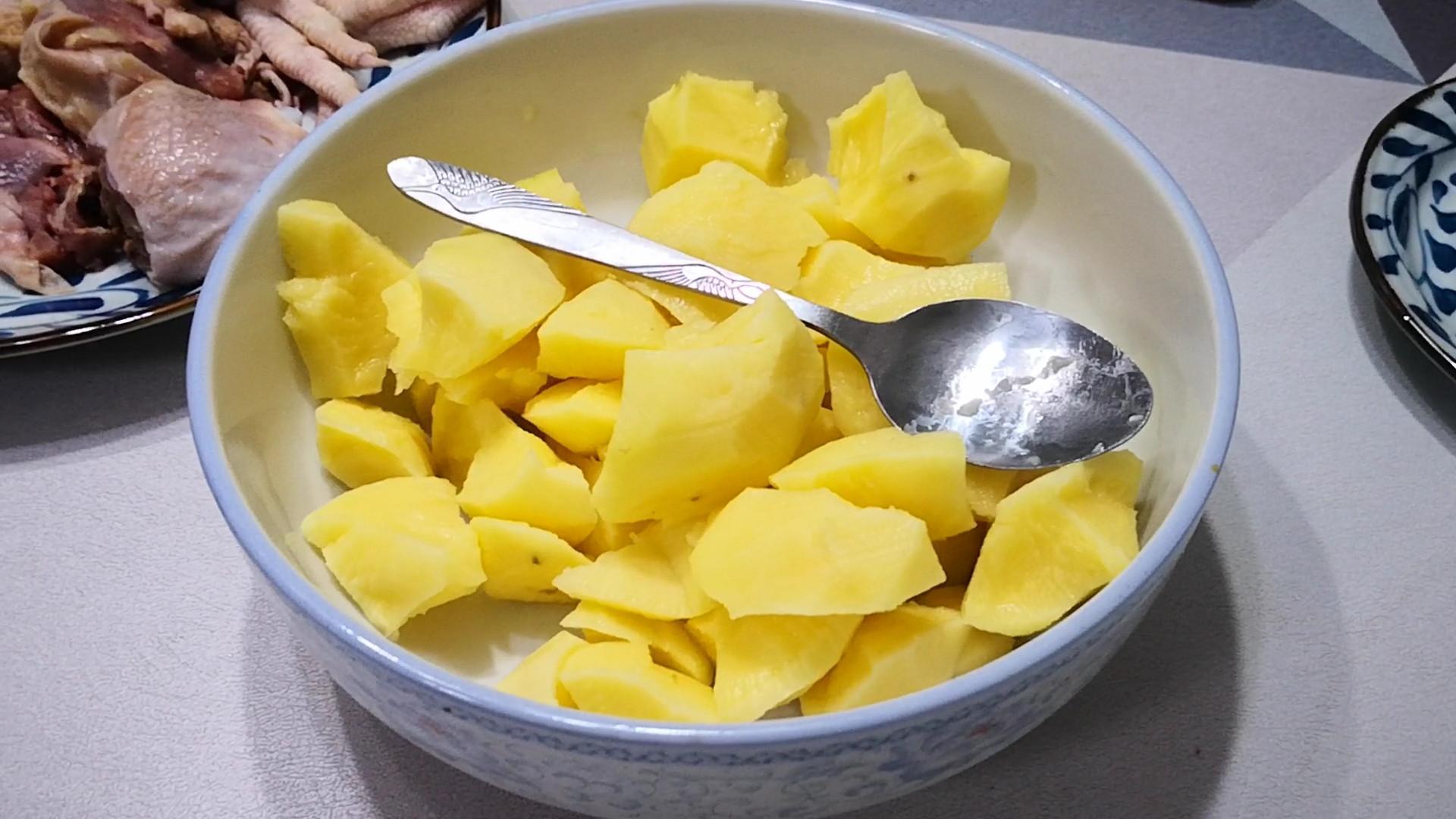 2.土豆兩個去皮洗淨後,切成小塊備用,我更喜歡用勺子把它挖成不規則的小塊,會更入味。