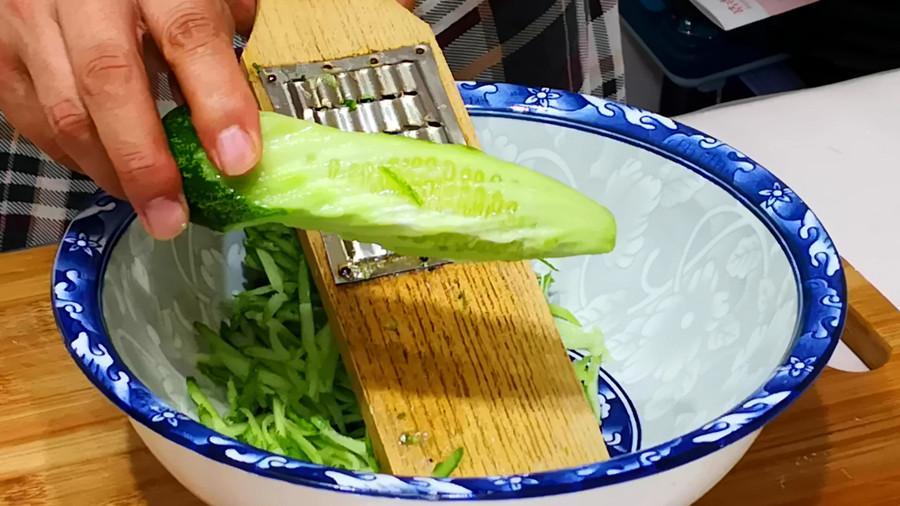 1、鮮嫩的黃瓜洗淨後擦成細絲放入碗中,接着加入一勺鹽醃製10分鐘。目的是殺出黃瓜裏的水分,防止包餃子時出水。需要注意一點:黃瓜檫絲時只要瓜皮不要瓜瓤,瓜瓤包餃子口感不好,可以生喫。