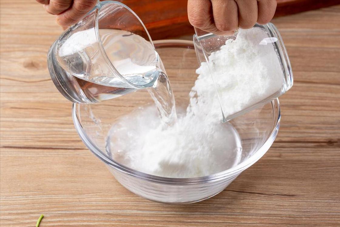 1、調料先不說,我們重點來講一下涼粉的製作過程,準備一個大碗,將豌豆澱粉倒進去,然後倒入同等克數的清水。