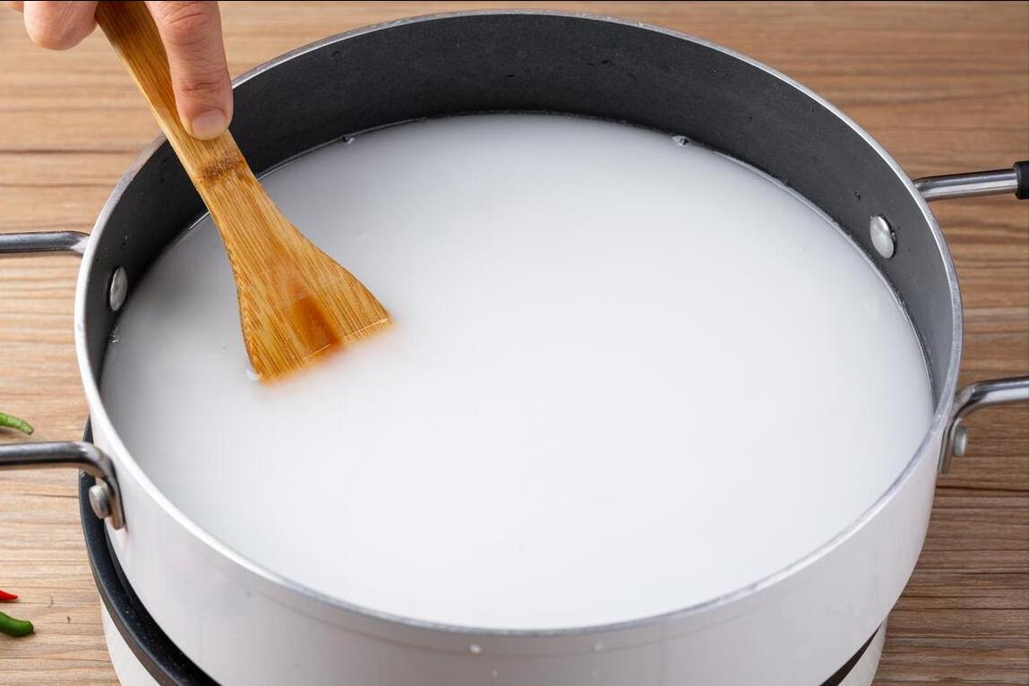 3、煮沸以後先不着急倒入澱粉水,而是需要往裏面,加上1勺食鹽,這就是“多放1味料”,加上鹽以後做出來的涼粉,會更及時Q彈,而且不易碎。接下來,我們將剛纔攪拌好的澱粉水,重新攪拌一下,然後倒入沸騰的水中。