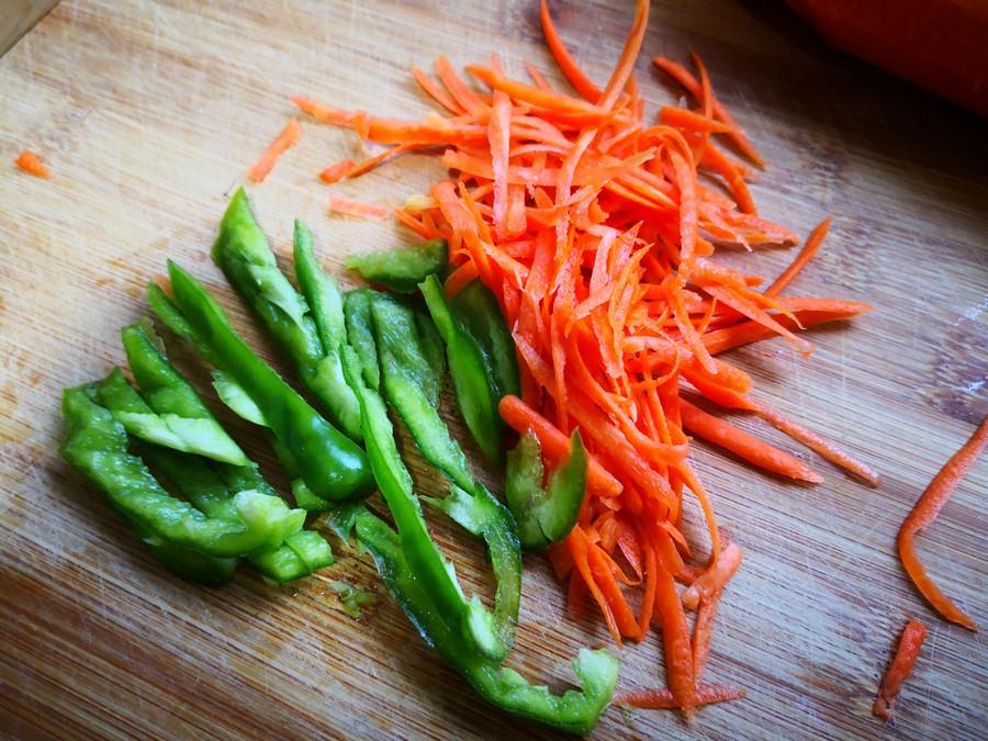 2.再根據自己的好喜好準備配菜,我準備了紅顏色的胡蘿蔔絲和綠顏色的辣椒絲。