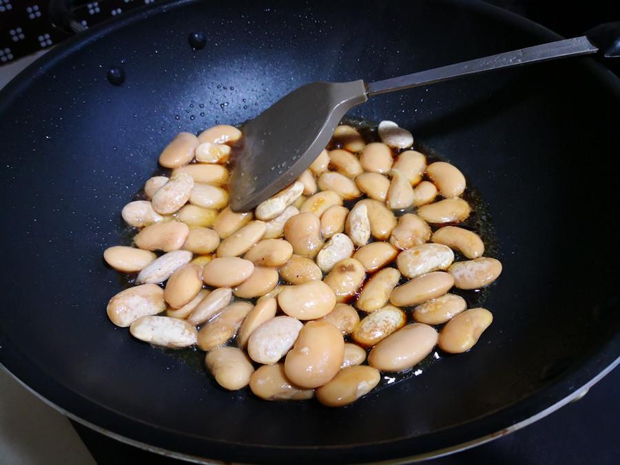 1.先將大白豆浸泡後,放到高壓鍋中煮軟,然後撈出備用。