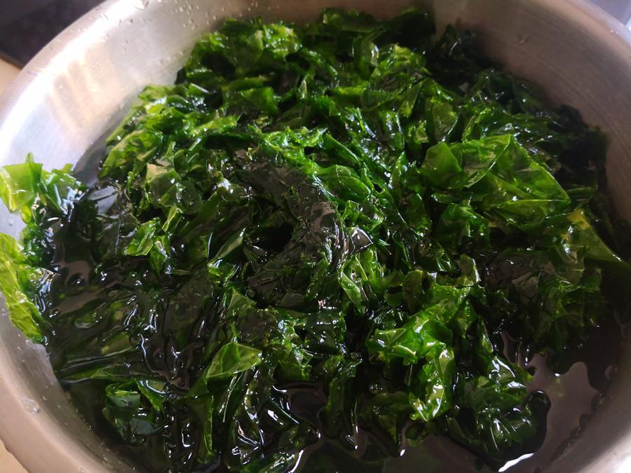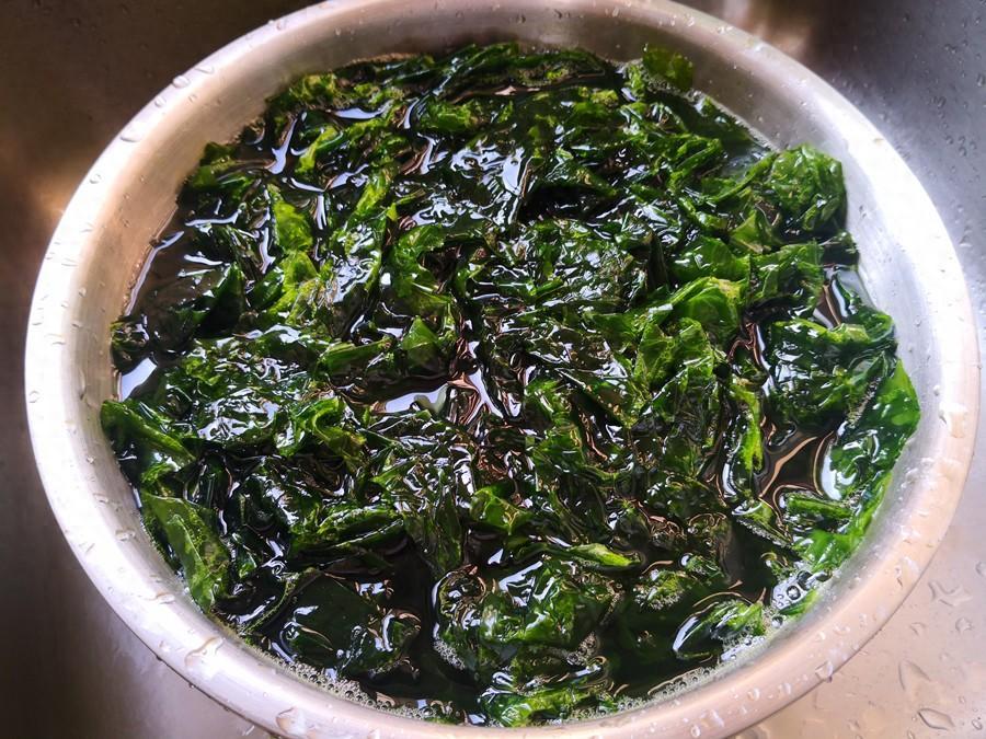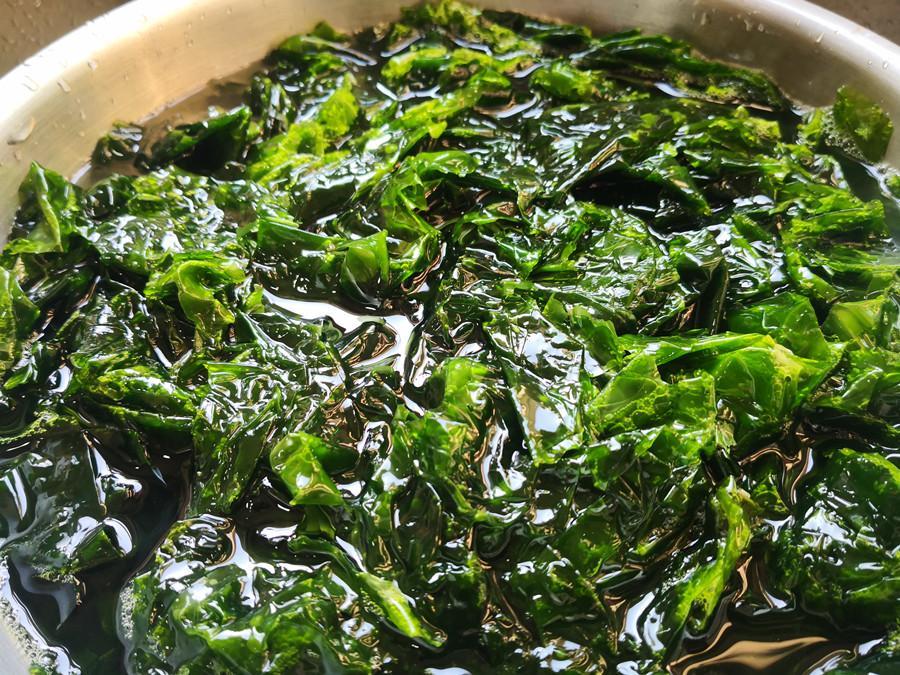 再起鍋加水,燒開後放入裙帶菜焯水,約一分鐘後撈出裙帶菜過涼水,再擠乾淨水分後切碎剁細,放入大碗中備用。