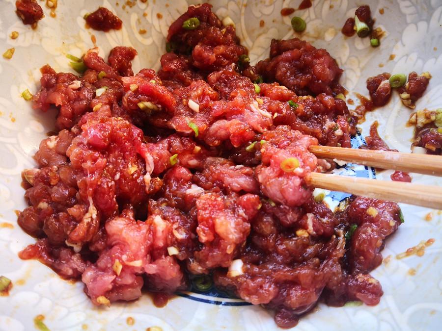 3.取一塊五花肉剁細後放入大碗中,然後加入適量的薑末和蔥花,攪拌均勻後再加入兩勺生抽,一勺蠔油,少許老抽調色,適量的花椒粉和胡椒粉,攪拌均勻後再磕入一個雞蛋(加雞蛋可以讓肉餡更加滑嫩多汁),然後醃製20~30分鐘。