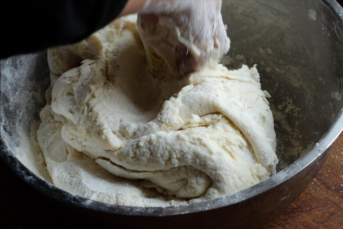 2、將清水和白糖倒在鍋中,燒開後趁熱倒入麪粉中,用筷子充分攪拌,直至沒有乾粉爲止。等晾涼到不燙手的溫度後,接下來開始揉麪,將其揉成一個光滑的麪糰,揉成麪皮狀備用。
