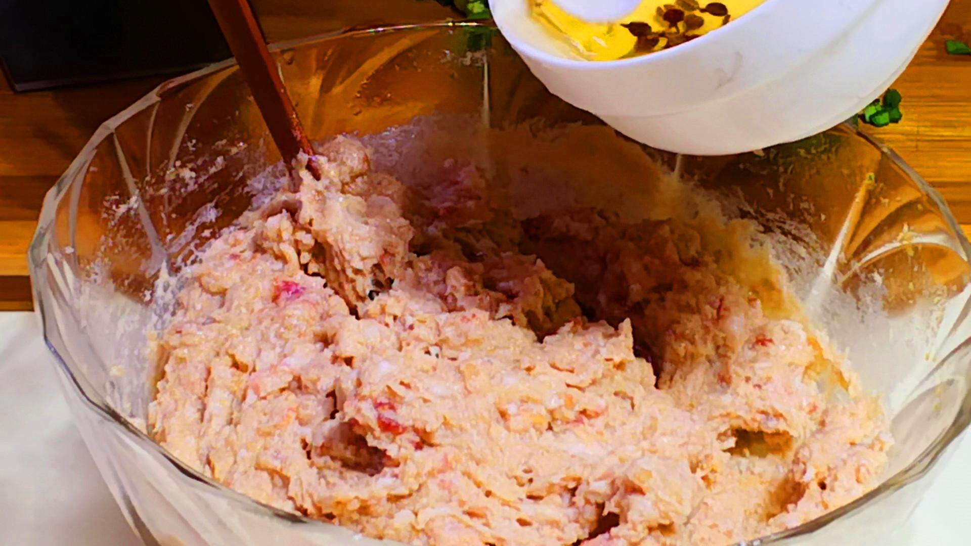 6.剁好的五花肉餡和魚肉餡放到一起,攪拌均勻後開始打入蔥姜水,蔥姜水要分3次打入,每加一次便用筷子順時針不停地攪拌,攪至餡料將水全部吸收後再打入下一次,攪打上勁後再加入一個雞蛋。