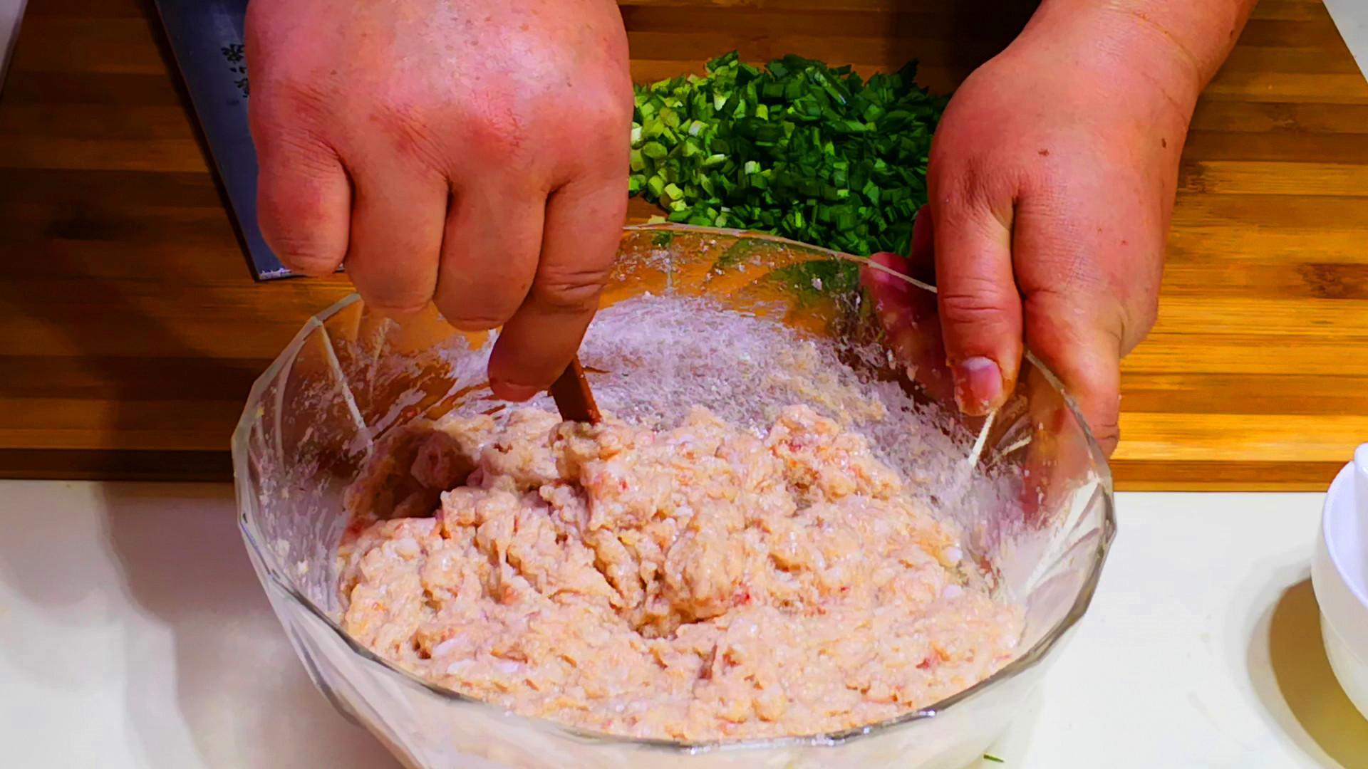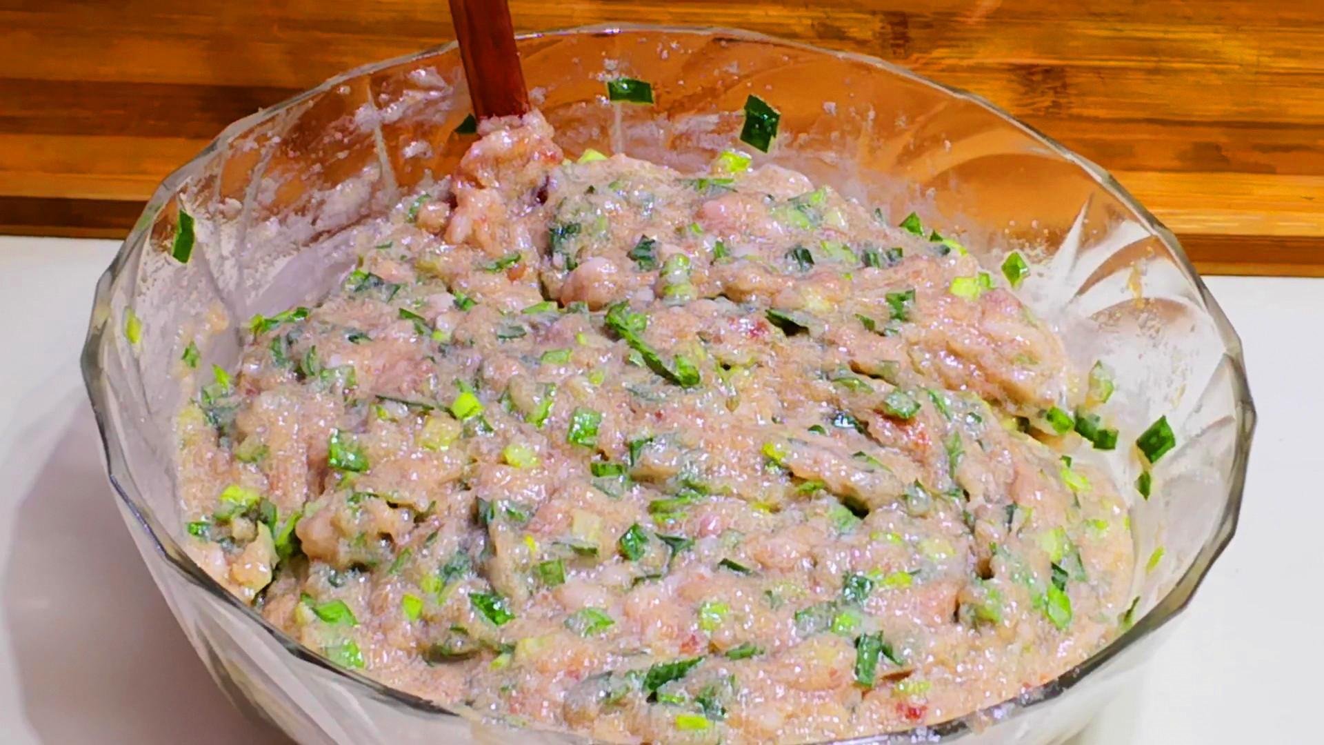 繼續攪拌均勻後再將切細的韭菜放入,然後調入適量的白胡椒粉、鹽、雞精,攪勻後再加入一大勺食用油,再次攪拌均勻即可,這樣調好的鮁魚餃子餡鮮嫩又多汁,超好喫!