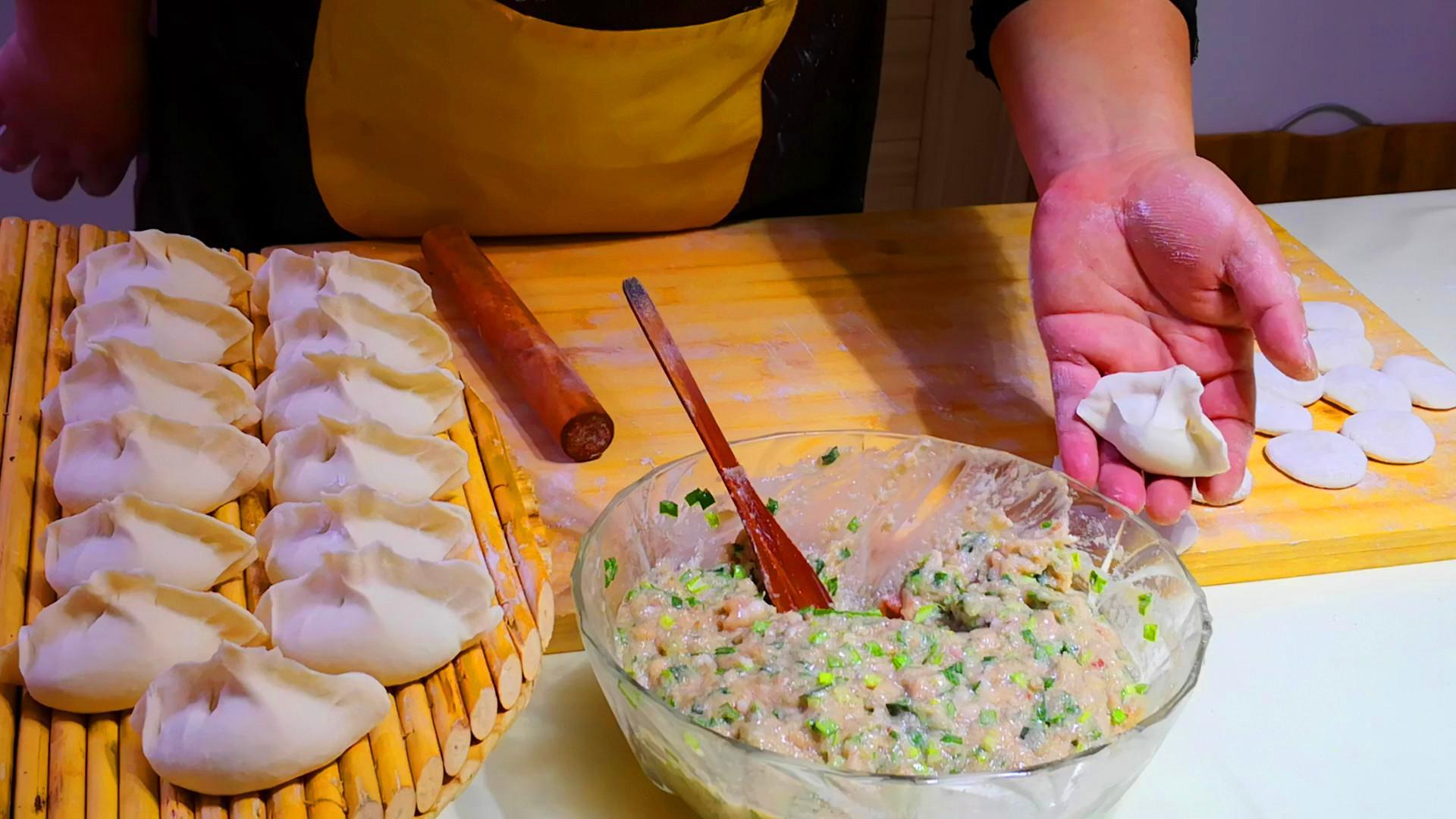 7.再將醒好的麪糰揉一揉,搓成長條,分成小劑子,擀成餃子皮,包好餡料捏起來。
