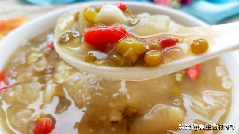 推薦喫法, 綠豆銀耳冰糖水。搭配銀耳, 百合, 蓮子,枸杞,冰糖一起煮水喝,營養豐富互補,是酷夏裏一道清涼飲。