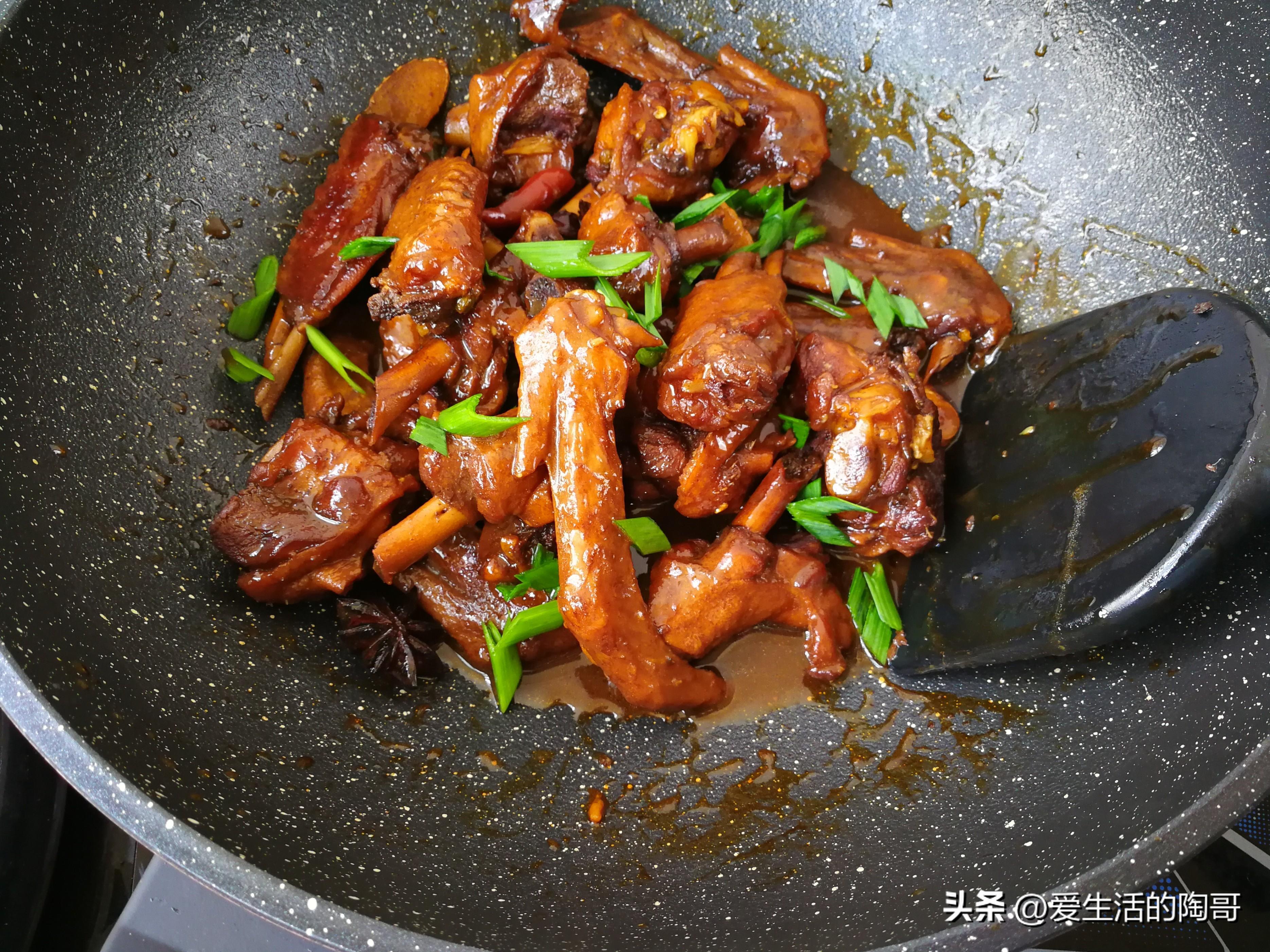 3把鴨肉水分炒幹,炒出鴨塊中的油脂,炒至微黃。加入鹽,老抽,生抽,翻炒均勻