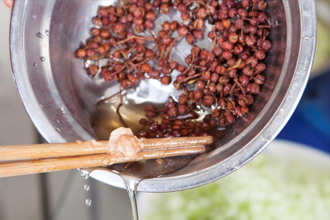 1、首先先準備一些花椒,倒在一個小碗中,然後往裏面倒入適量的開水,浸泡片刻直至晾涼爲止。