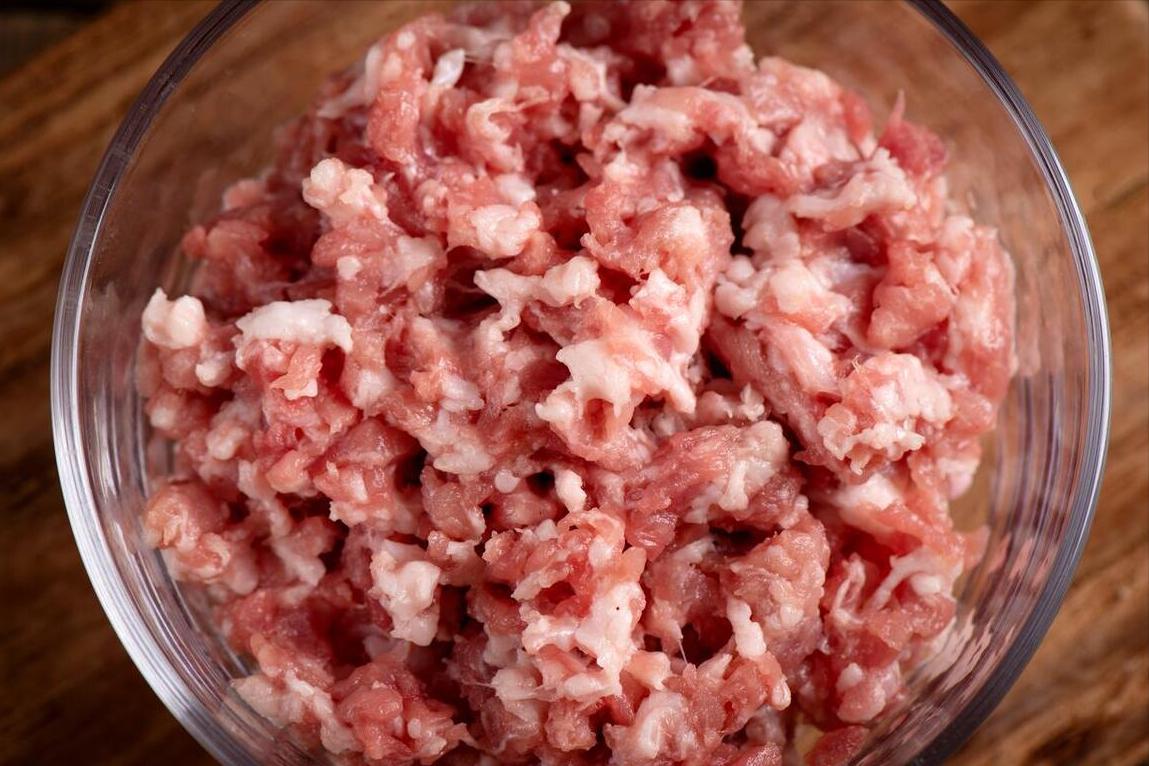 2、下面我們將豬肉清洗乾淨,要用肥瘦相間的一塊,洗好之後切成小塊,然後倒在絞肉機內,順便把蔥姜也扔進去,省的用刀切麻煩了。將其放進去以後,把蓋子蓋上,然後開始絞肉,直至將其絞成細膩的肉餡。