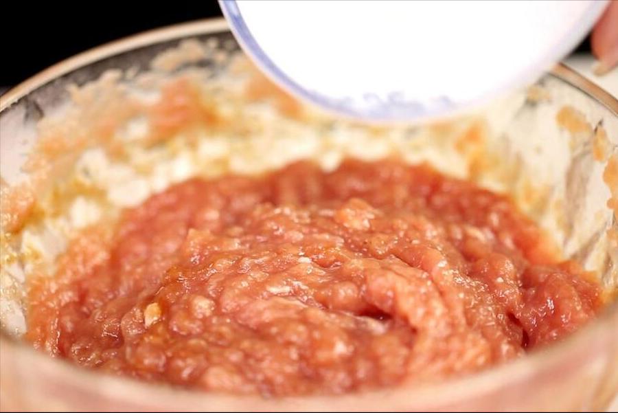 3、接下來將花椒水倒入肉餡中,繼續蓋上蓋子充分攪打,直至上勁爲止。花椒水,是多加的第1樣,加進去以後肉餡會變得更鮮嫩、更多汁。接下來我們再往肉餡中來上適量的生抽、蠔油、鹽、白胡椒粉、味精。