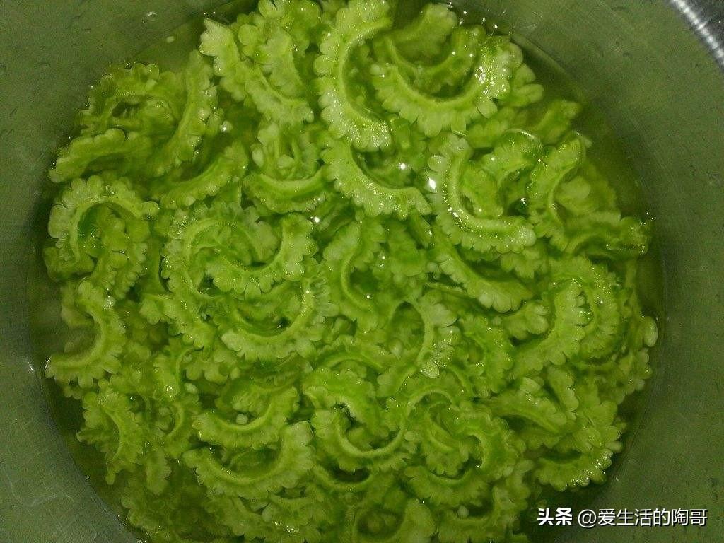 1鹽水浸泡,苦瓜切片,放鹽水裏泡一會,可以減輕苦味。
