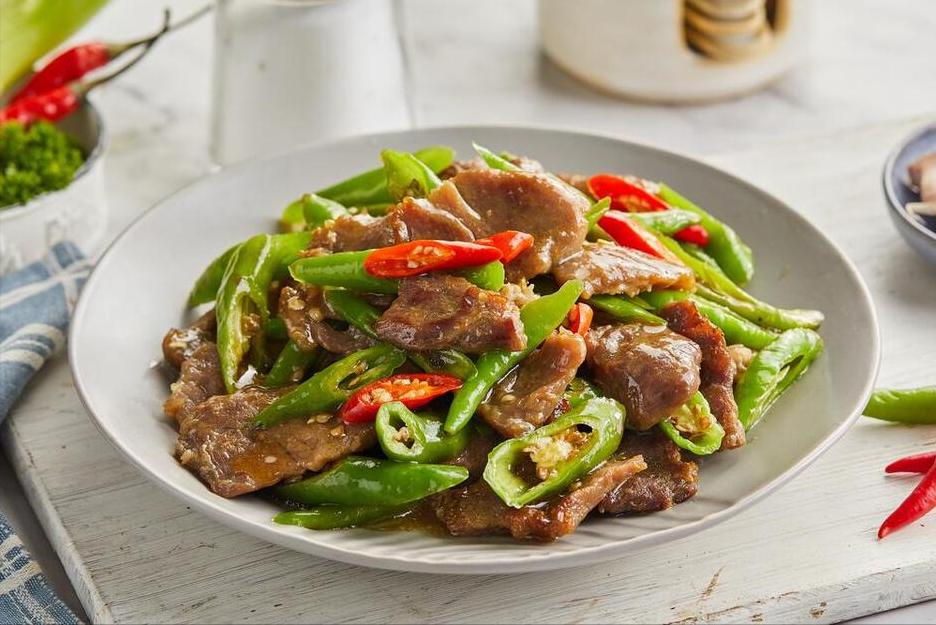 用到:青辣椒、牛肉、大蒜、生薑、鹽、黑胡椒粉、生抽、蠔油、澱粉、蛋清、植物油