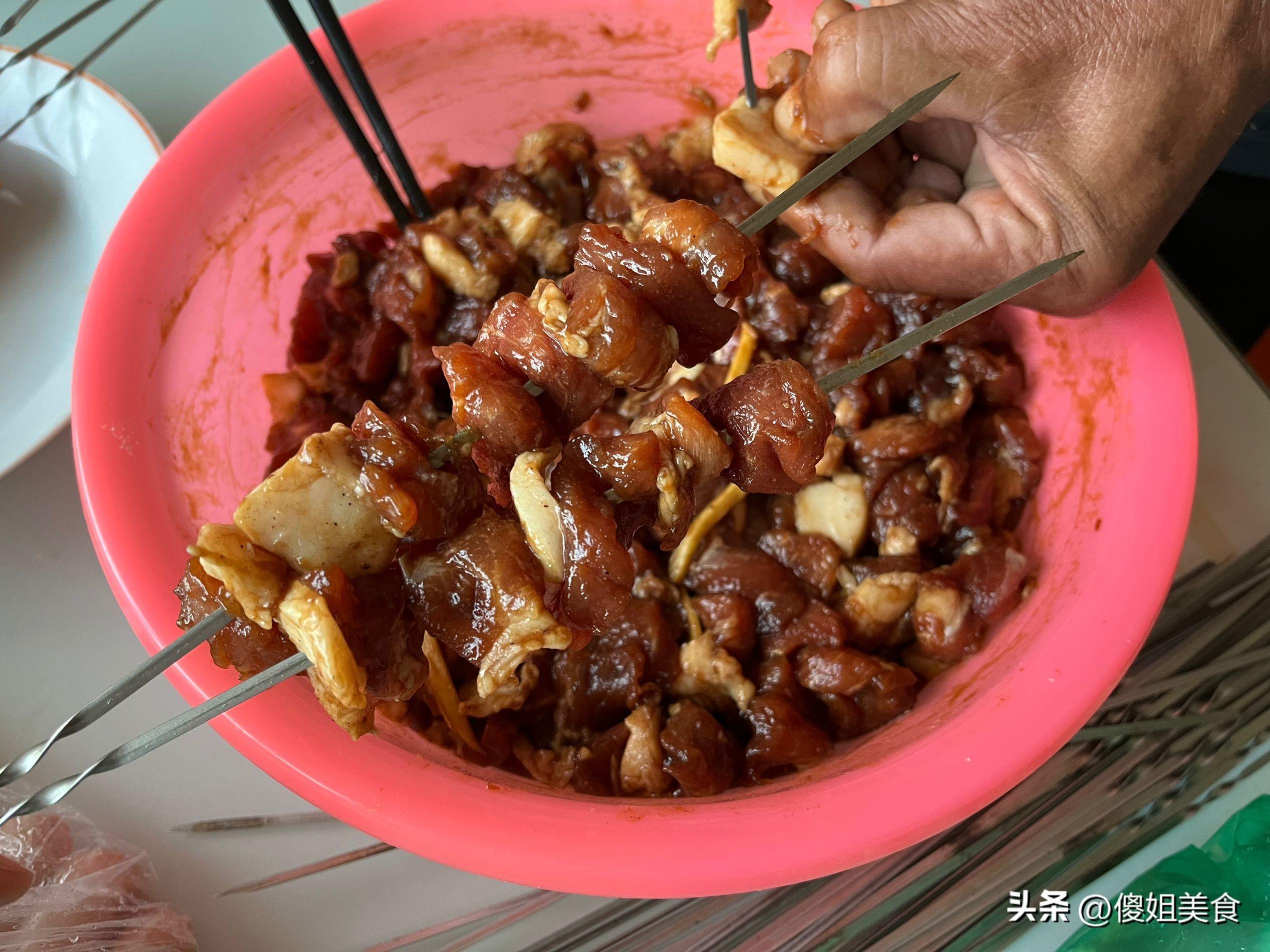 買豬肉的時候選一塊瘦肉多的,略帶一點肥肉喫起來香,豬肉是俺老爸親自切的,不瞞大家說這個肉塊切的可真不小,比外面賣的要大一半的。老爸醃肉的時候放的味極鮮、十三香、料酒、少許醬油、蠔油、薑絲、蒜片和鹽(各種調味品可根據肉的多是增減),醃上2-3個小時,讓肉醃製入味,最後把豬肉串到簽字上,每個簽字6-8塊錢就可以。