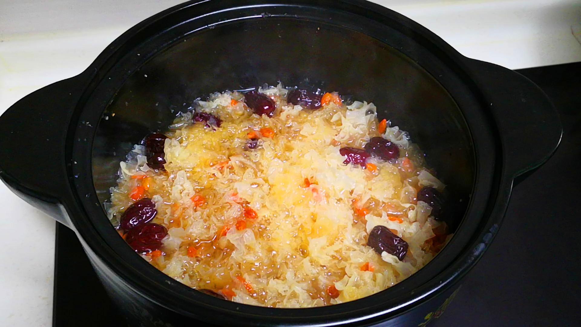 3、處理好的銀耳放入砂鍋中,然後按照水和銀耳5:1的比例加入水,水量要一次性加夠,不要邊煮邊加,否則會沖淡銀耳的膠質,從而影響銀耳的出膠量;煮銀耳是一個慢功夫,邊煮邊攪拌,防止糊鍋和溢鍋,出鍋前5~6分鐘的時候撒入紅棗和枸杞、適量的冰糖,再繼續煮5分鐘,然後就着砂鍋的餘溫繼續燜上十幾分鍾,使銀耳羹更加軟糯好喝。