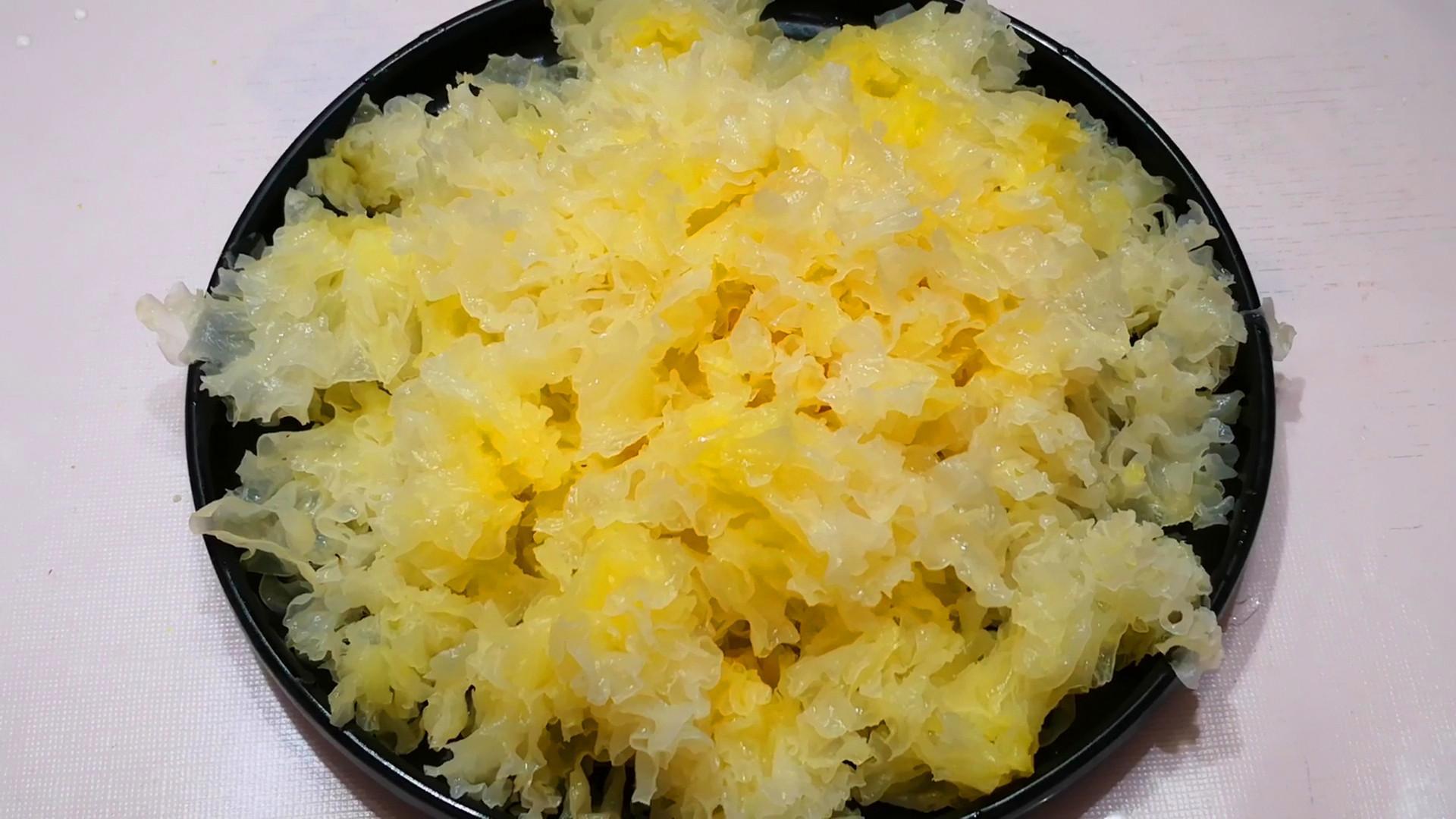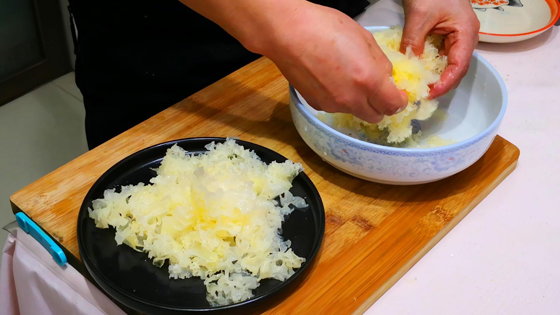 2、泡發好的木耳沖洗乾淨後就要撕銀耳,銀耳出膠效果和這一步有很大的關係,好多人煮銀耳羹時,只是把銀耳很隨意的撕幾下就丟到鍋裏煮了,往往銀耳煮得很爛乎了,卻還是不出膠,這就是因爲銀耳沒有撕對。銀耳的個頭越小越好,這樣銀耳與水的接觸面積就越大,煮時也就更容易出膠,出膠量也會相對增多。