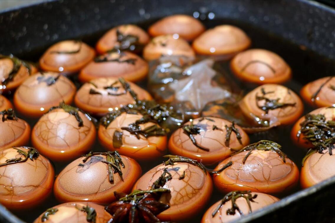 用到:雞蛋、香葉、八角、花椒、小茴香、鹽、茶葉