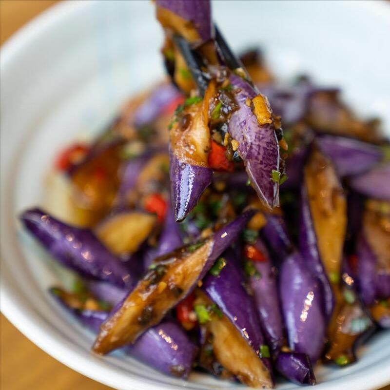 用到:茄子、青辣椒、大蒜、鹽、雞精、白糖、生抽、老抽、香油、食用油