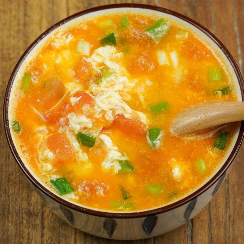 2、鍋子裏倒油,先把番茄炒一下,炒出湯汁以後往其中加水,等水燒開之後先將澱粉水倒在鍋子裏,然後再將蛋液淋入鍋中,這樣稍微煮一會兒,就凝固定型啦,這個時候加上適量的鹽、雞精調味,最後撒上一把蔥花,開喝。
