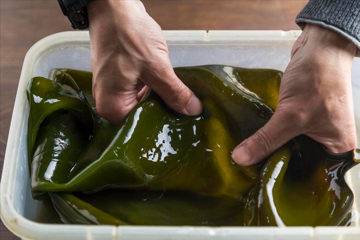 3、這樣拿出來感受一下,質地也變得非常軟了,這個時候將其轉移到清水中,然後開始搓洗,搓洗乾淨之後,重新準備一盆水,將蒸好的海帶放進去,繼續浸泡上20分鐘的時間,海帶就完全泡發好了。