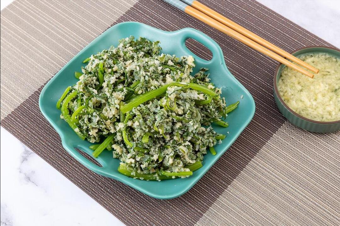 用到:茼蒿、大蒜、小米椒、醋、生抽、蠔油、鹽、雞精、麪粉、玉米麪