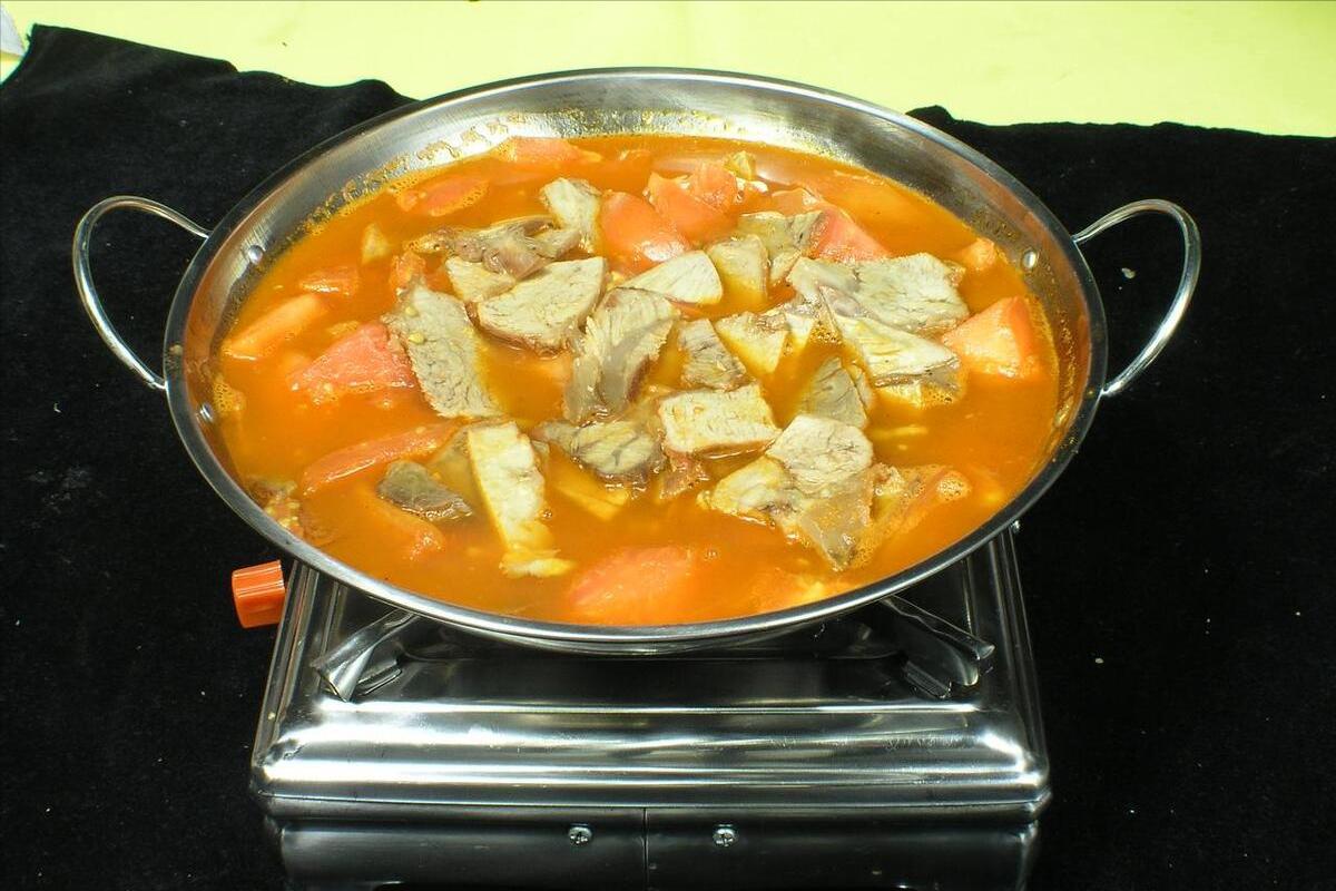 2、之後往鍋內倒油,下入西紅柿翻炒,炒到出沙以後再來1勺番茄醬,接着下入牛腩翻炒,炒到變色後加上蔥姜、大料、香葉、八角、桂皮,炒出香味以後來點生抽、老抽、料酒調味,接着添上大一鍋開水開始燉。