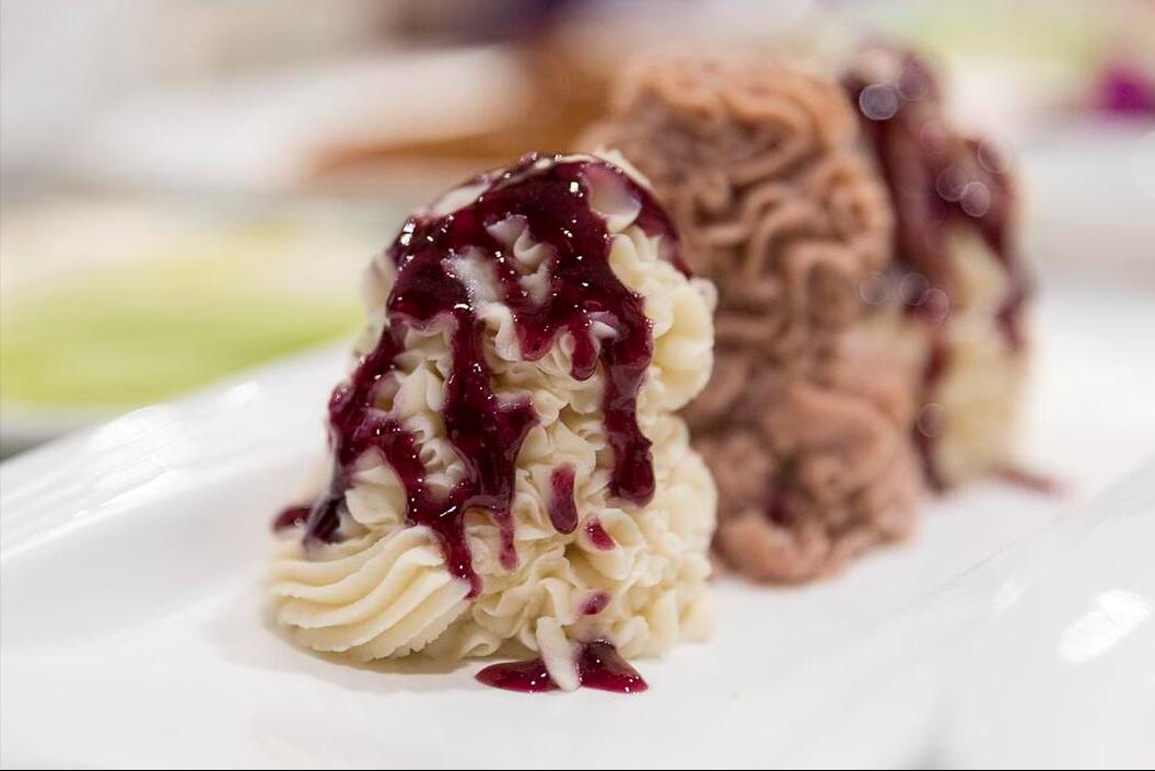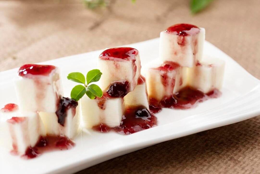 鐵棍山藥洗淨後把外皮削掉,然後上鍋蒸,蒸熟蒸軟了之後取出來,用勺子壓碎。然後盛在裱花袋裏,擠在盤子裏就行了。下面將藍莓醬倒在小碗中,用一點點清水攪勻,然後淋在山藥上即可。