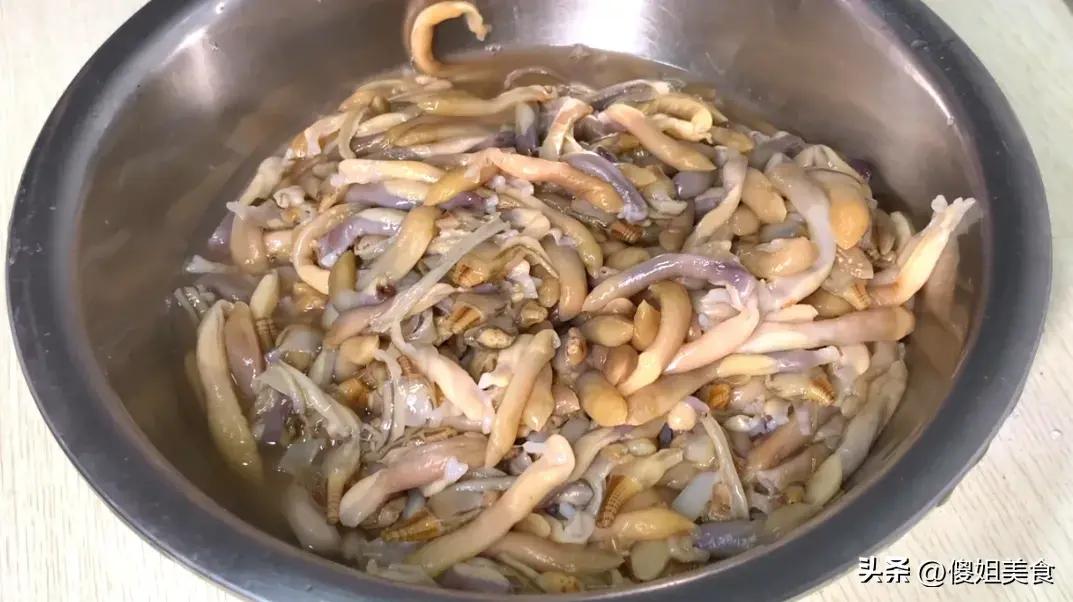 夏天正是喫竹節蟶的好時節,碰到它可別手軟,退潮時多抓一些放冰箱裏,留到冬天喫。不能自己抓的朋友,可以趁着現在蟶子便宜,多買一些回來剝肉存起來。每次趕海,我能抓到六七斤蟶子,有些漁民一次能抓十多斤,一上岸就賣光了,特別受歡迎。而我抓得再多也不賣,留着自己喫。這一大盆蟶肉,可以填滿整個夏天的冰櫃,一直喫到來年。