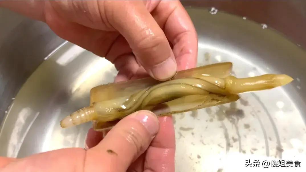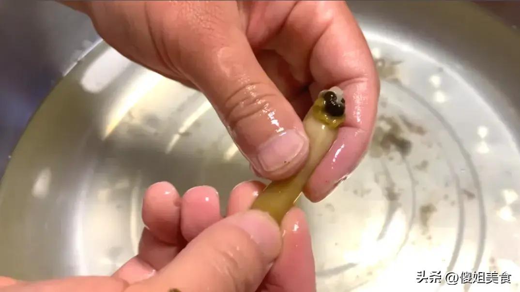 把肉剝出來後,先把內臟去掉,也就是黑色部分,雙手輕輕一擠就出來了。還有和大蝦一樣的黑線,這是蟶子的消化系統,一定要去掉哦,很多人不知道,都直接喫了。內臟去除乾淨後,放入清水中搓洗幾遍,沙子就徹底洗淨了。