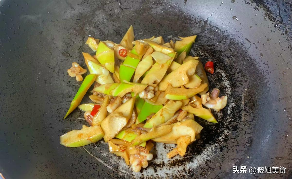 在翻炒的過程中,適時加入鹽、生抽、料酒進行調味。這道菜的關鍵在於火候的掌握,要保持大火快炒,以鎖住食材的原汁原味。當竹筍和魷魚都炒至斷生後,撒入少許雞精和胡椒粉,快速翻炒均勻,即可出鍋裝盤。