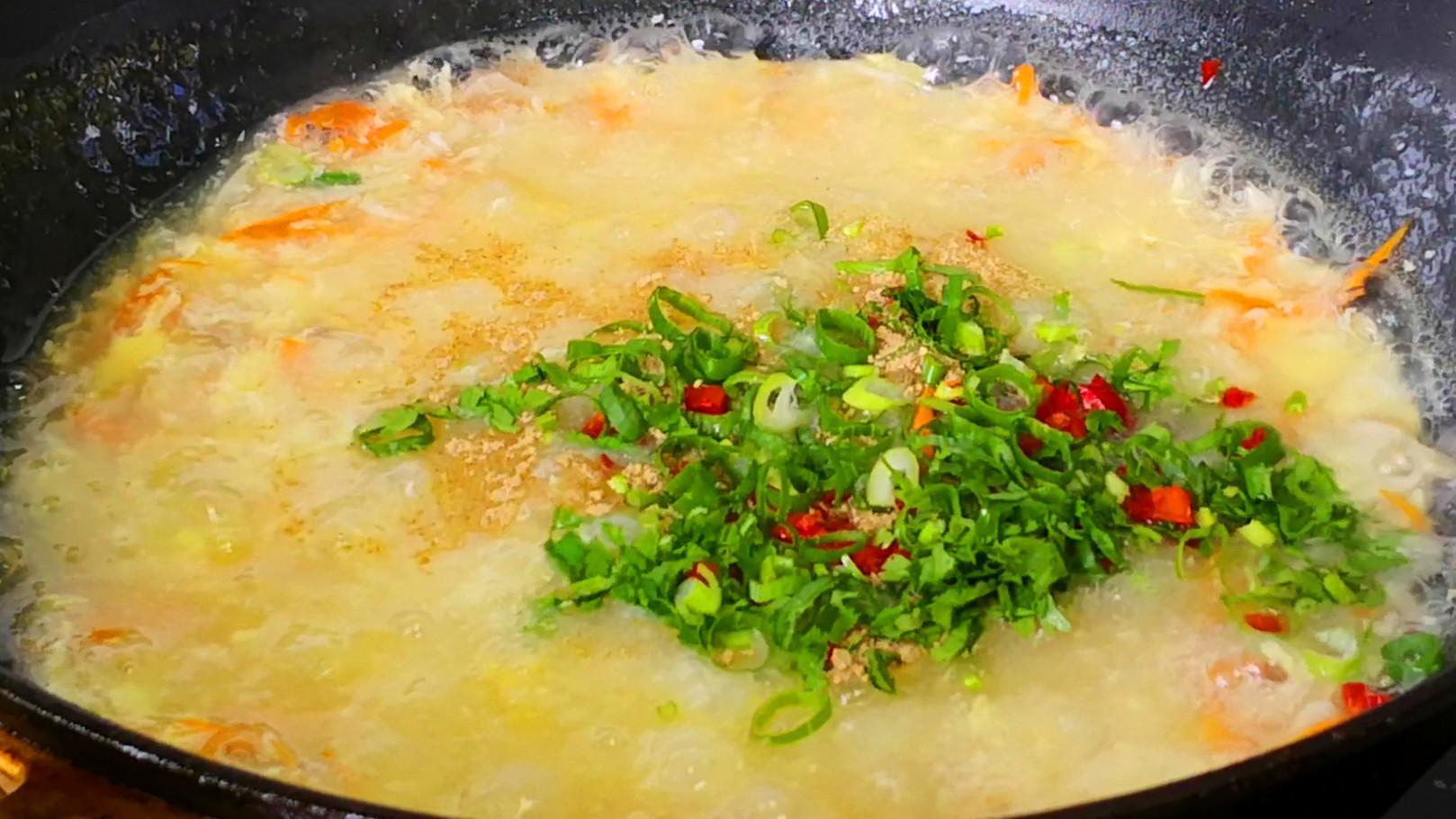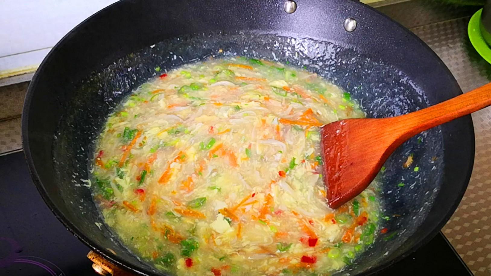 3.起鍋加適量的清水,燒至水冒泡時下入撕好的平菇,保持小火將平菇煮熟,把平茹的鮮味煮出來後再轉成大火,繼續將水煮開後下入胡蘿蔔絲、倒入之前調好的料汁,攪拌熬煮片刻後再倒入適量的水澱粉勾芡,煮至湯汁變濃稠後改成小火,然後用勺子轉着圈將蛋液慢慢地淋入,這樣做出的蛋花會非常地漂亮,等到蛋液凝固成蛋花後再轉成大火,然後下入紅椒丁、香菜段和蔥花,最後淋入少許的香油,攪拌均勻後就可以出鍋裝碗了。