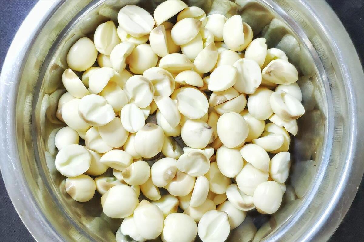 2、還有蓮子,清洗好之後,需要把裏面的小小的芯去掉,這一部分是發苦的,大多數人都接受不了。泡上差不多1個小時以後,我們將綠豆、蓮子、百合,一起倒在鍋子裏,然後往裏面添水。