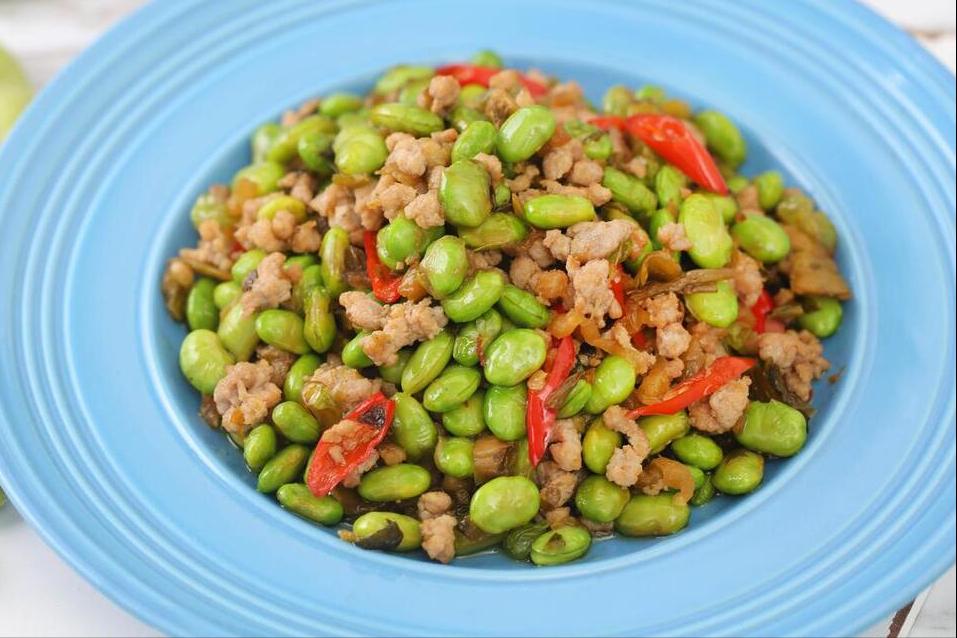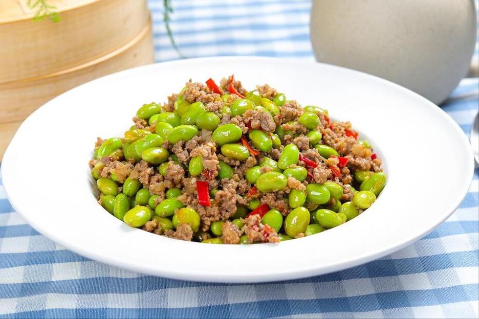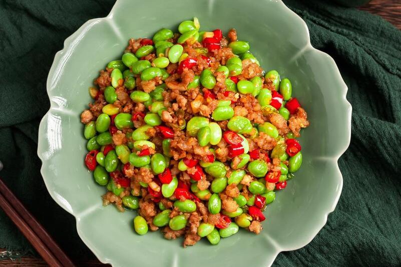 2、鍋內倒水燒開後,來1勺鹽,之後把毛豆倒進去焯水,隨後撈出備用。接下來往鍋內倒油,爆香蒜末後,下入肉末煸炒到變色,接着把毛豆倒進去,繼續翻炒一陣子,用鹽、雞精調味後,即可出鍋。